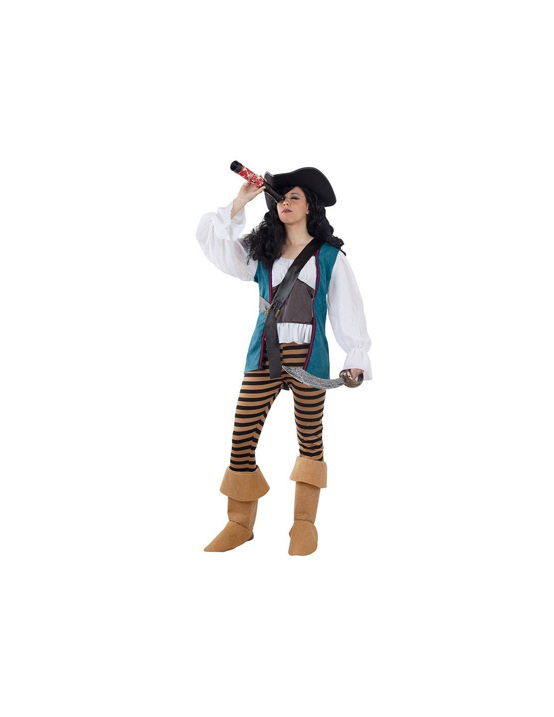 Disfraz pirata corsaria mujer que incluye camisa con chaleco, cinturón, pantalón y cubrebotas.