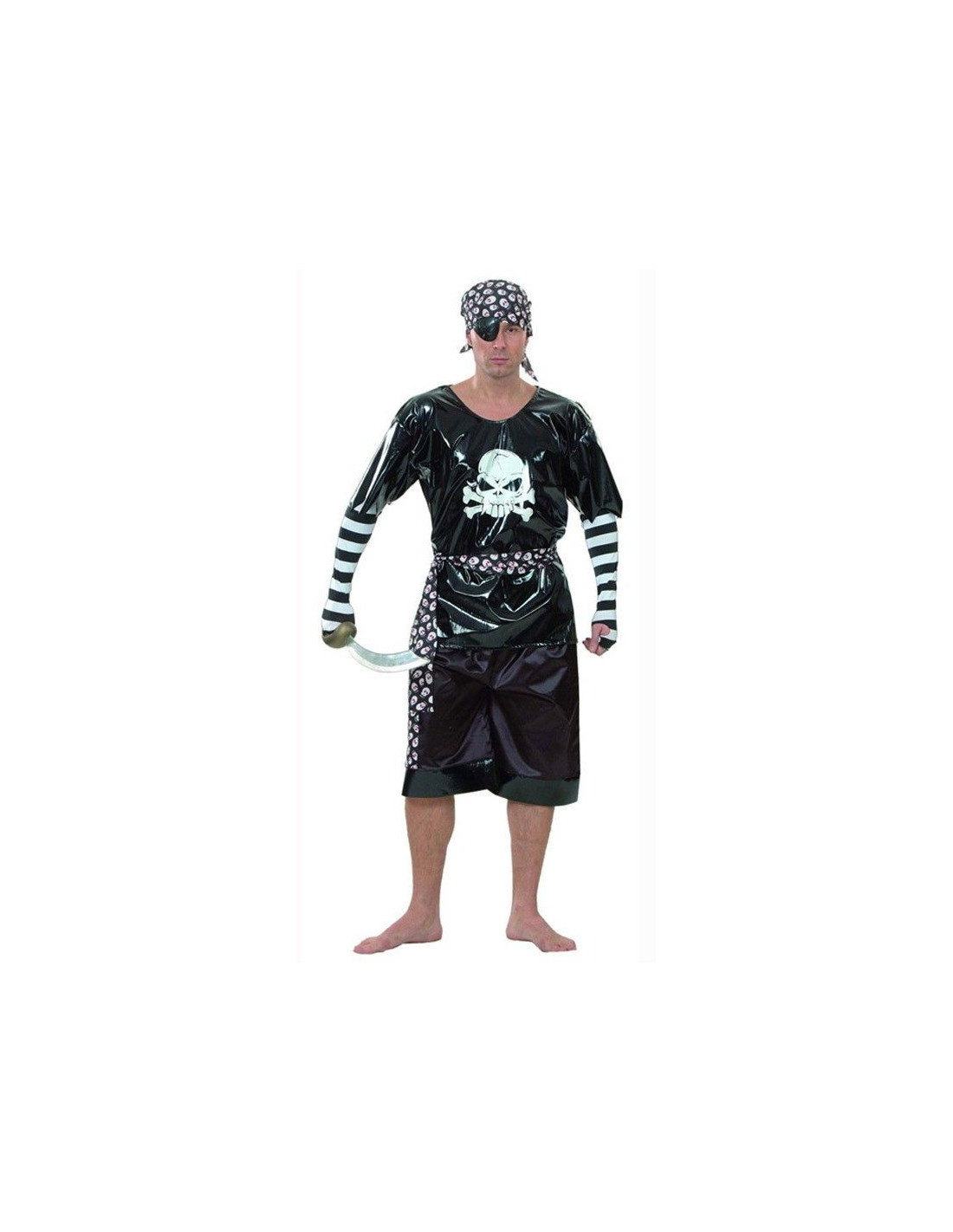 Disfraz de pirata malvado para surcar los mares en busca de nuevos barcos barcos que abordar. Incluye pañuelo cabeza, camiseta, guantes, pantalones y cinturón. Talla única.