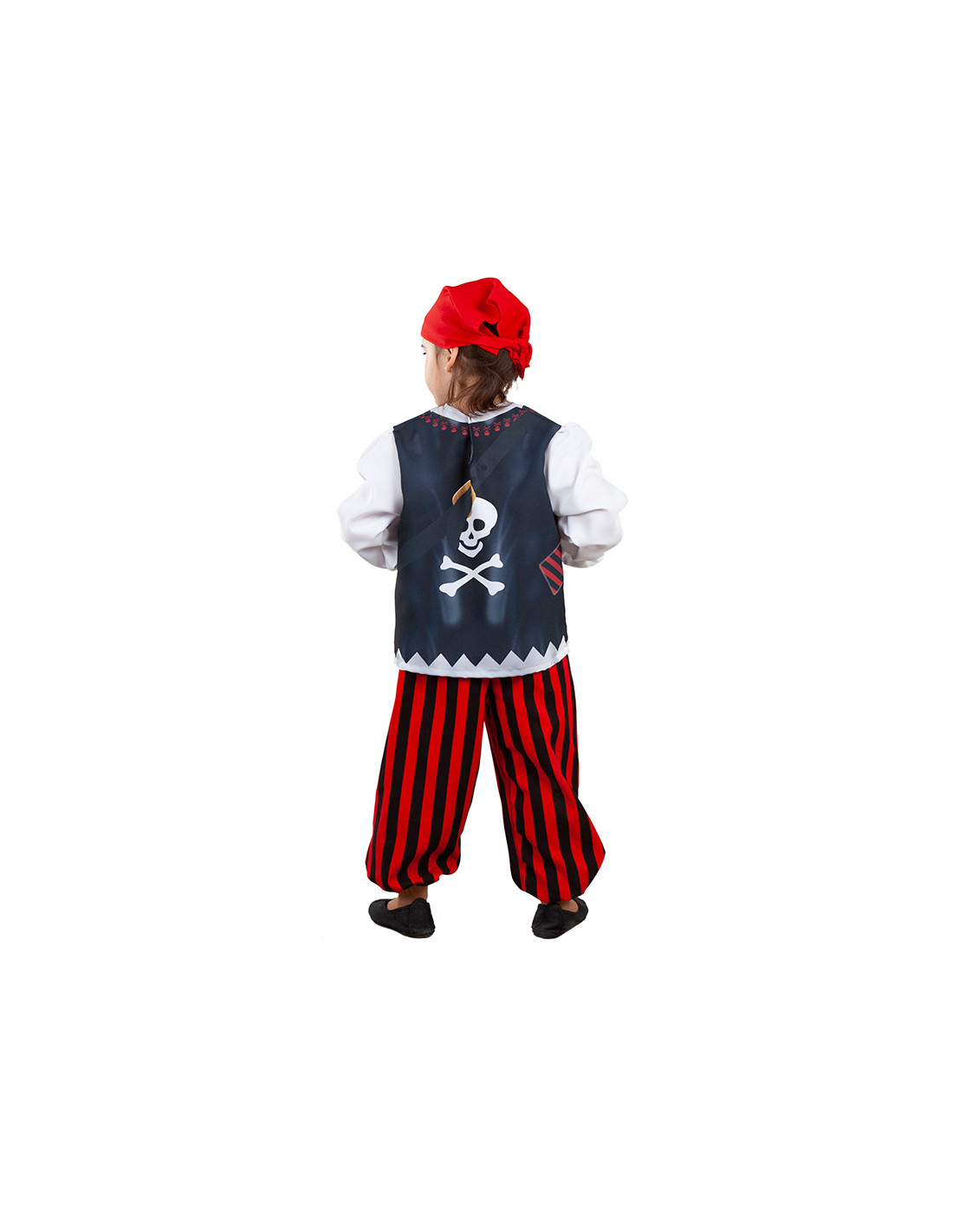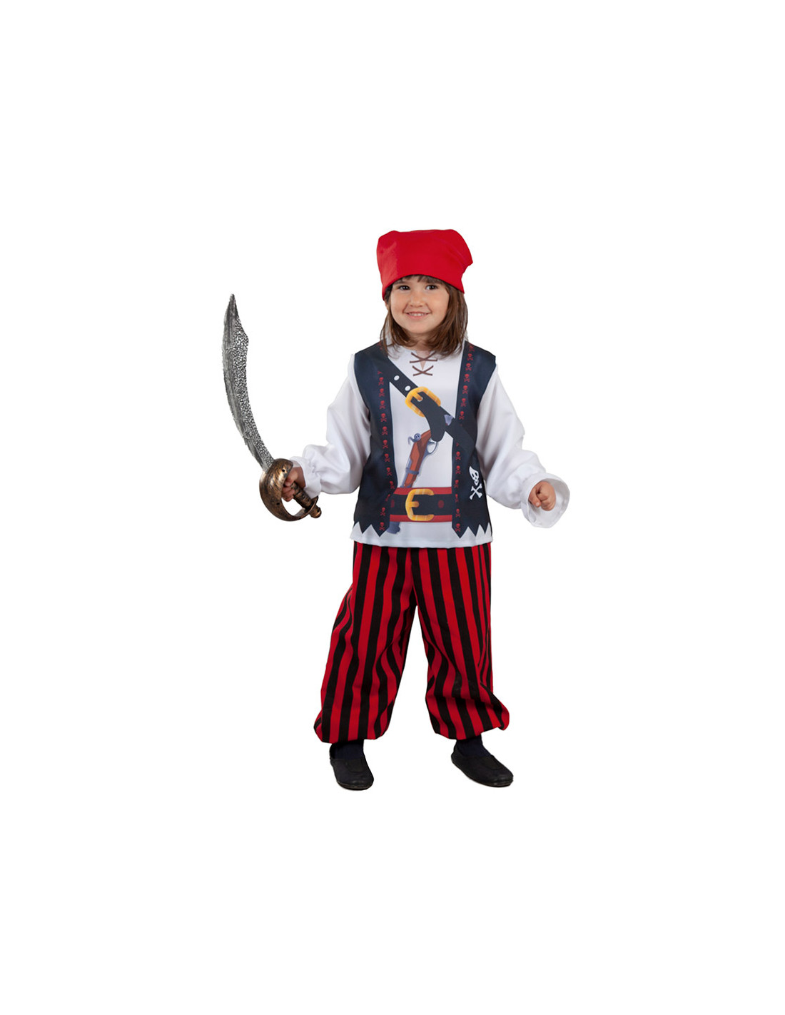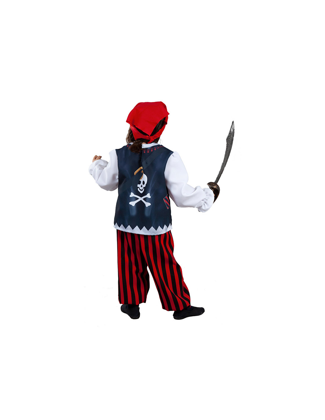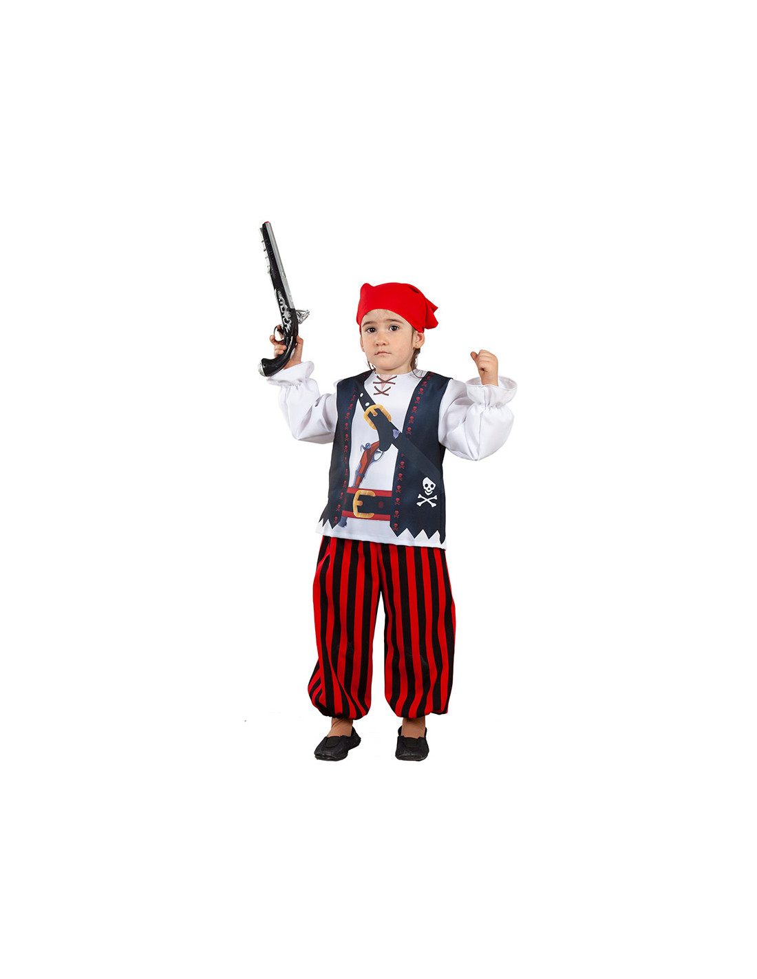 El disfraz pirata para bebé contiene un pañuelo rojo, una camiseta estampada por delate y por detrás con un montón de detalles: simula un chaleco con calaveras, cinturón y hasta un trabuco. Además el disfraz viene acompañado por un pantalón de rayas rojas y negras con goma en los tobillos para dar un efecto bombacho.