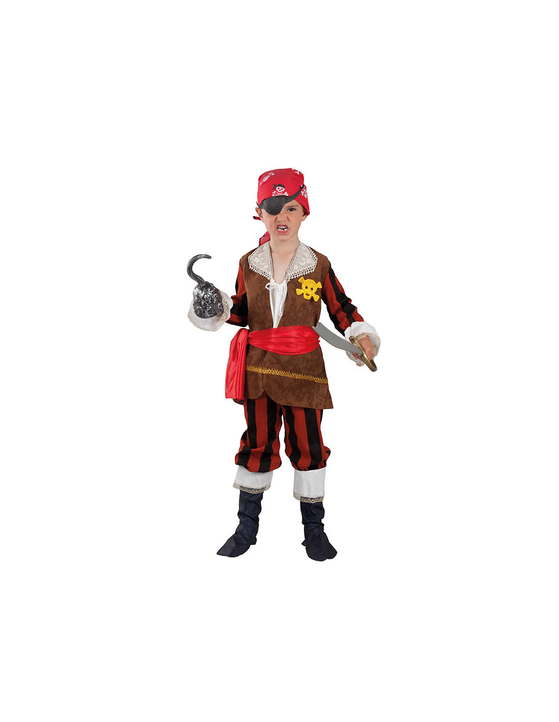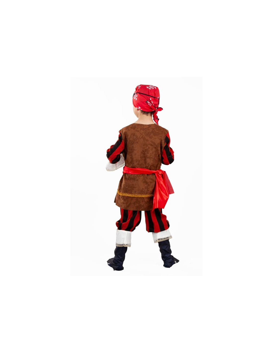 El disfraz pirata para niño contiene pañuelo rojo, parche, camiseta, fajín rojo, pantalón y cubrebotas.