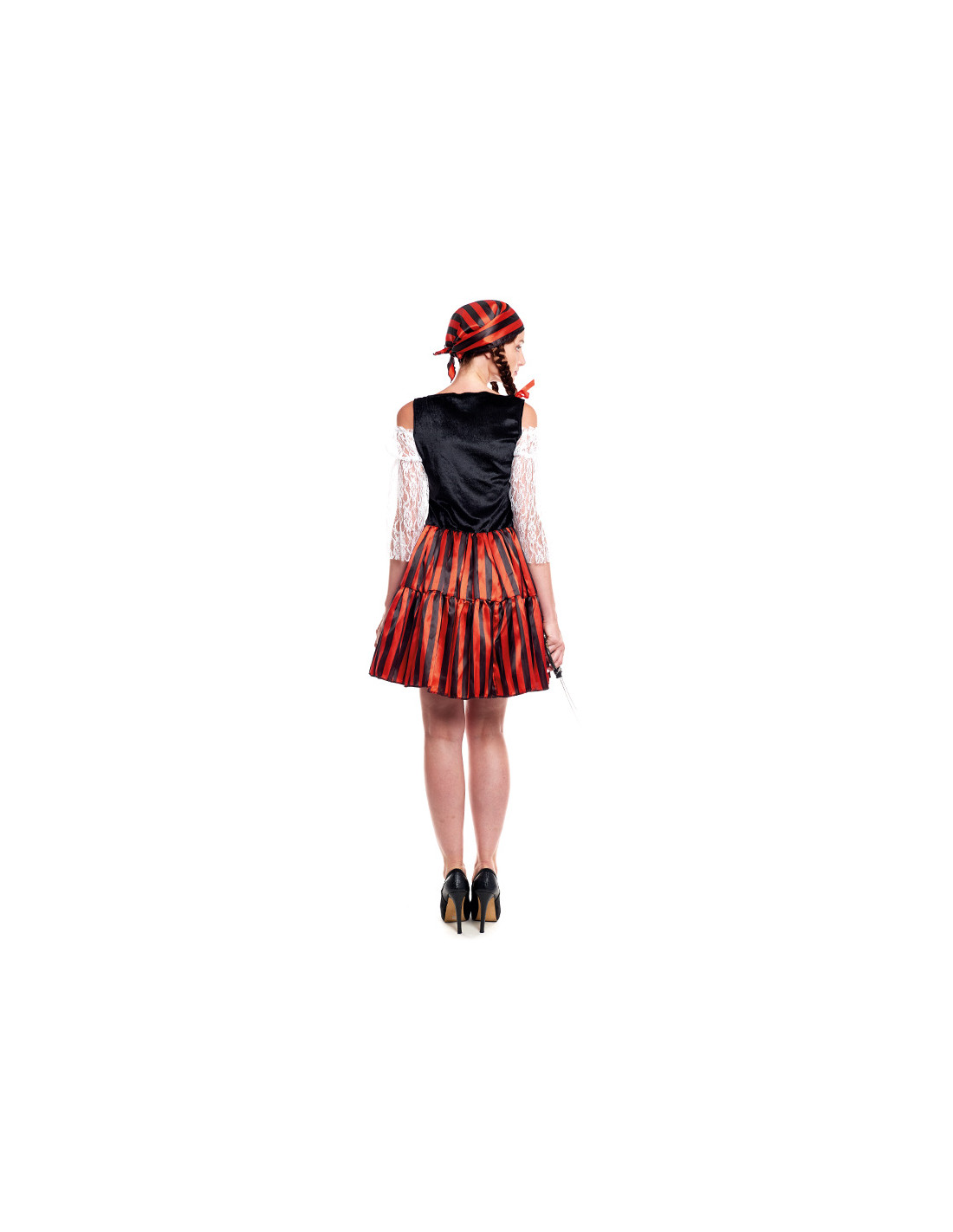 Disfraz pirata stripes mujer esta compuesto por, vestido y pañuelo. No incluye zapatos y espada.