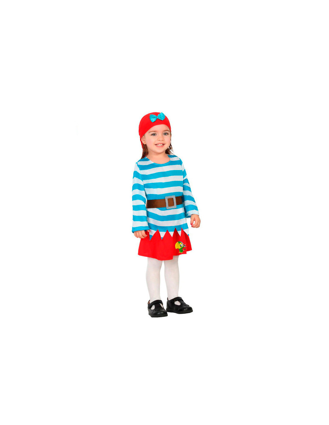Disfraz piratesa azul para bebé que incluye pañuelo rojo con lazo para la cabeza, camiseta a rayas con cinturón y falda roja con un loro impreso. Composición: 100% poliéster.