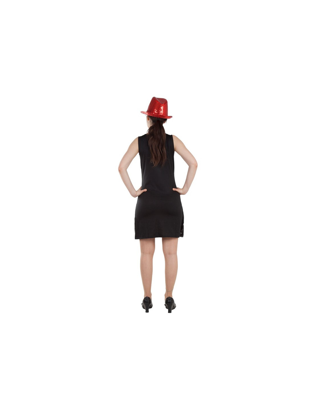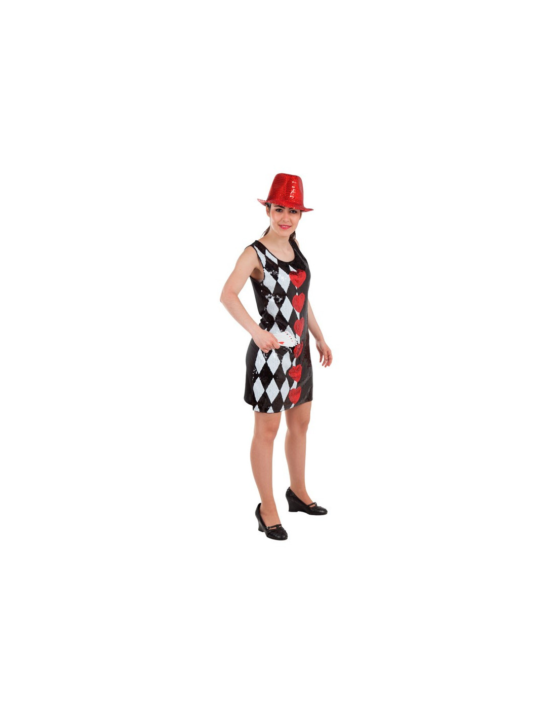 El disfraz Poker con lentejuelas contiene un vestido de tirantes negro con rombos blancos y corazones rojos. La parte trasera del vestido no contiene lentejuelas.