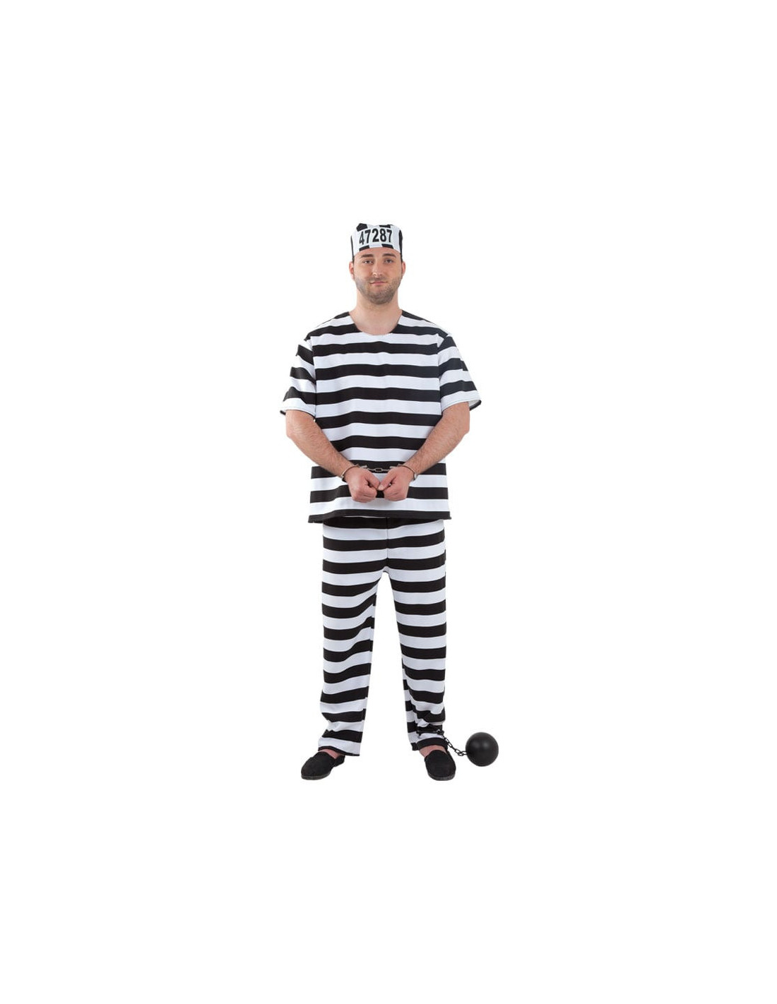 Disfraz de Preso para adulto, que incluye gorro, camisa y pantalon de rayas blancas y negras. El gorro lleva estampado una numeracion.