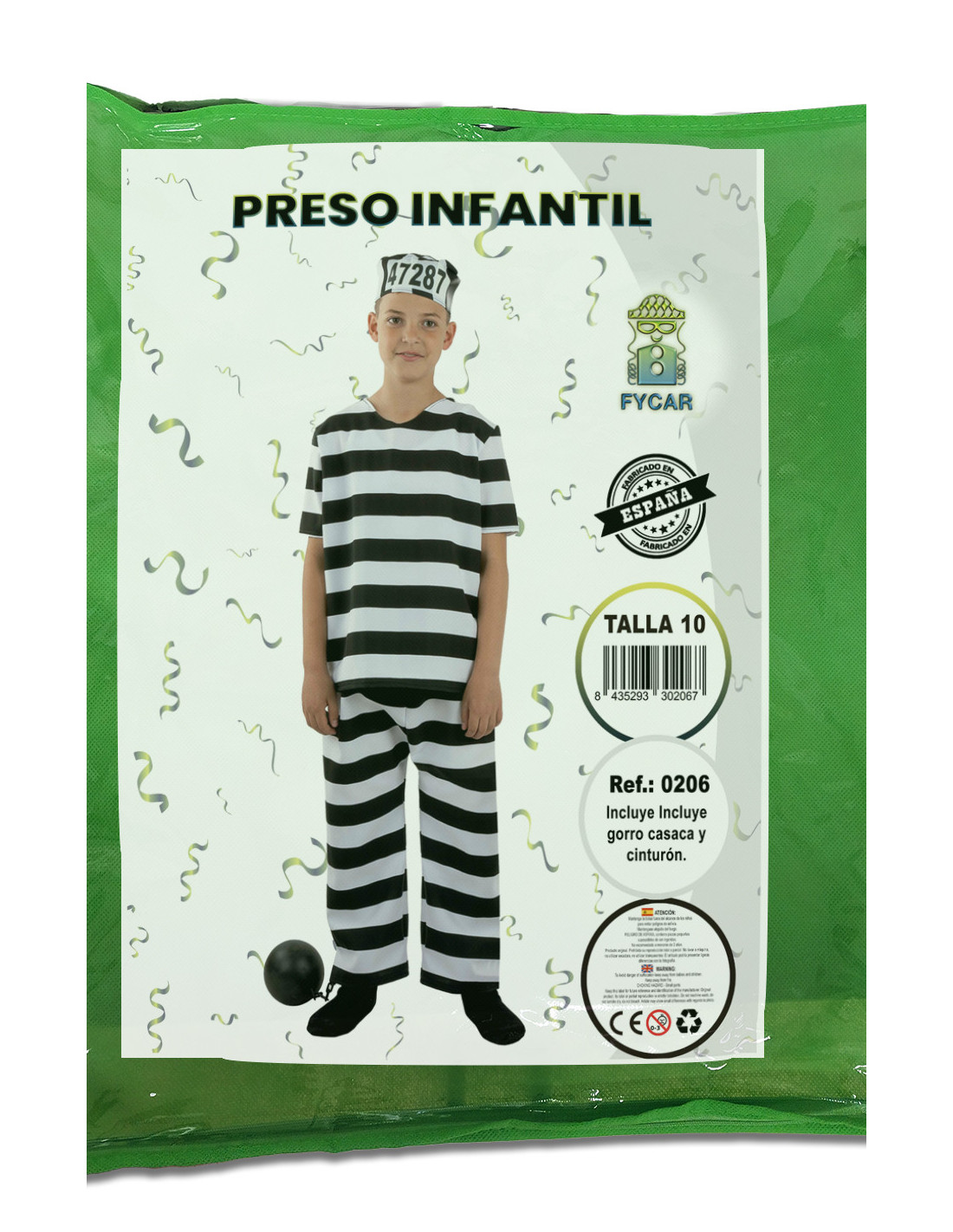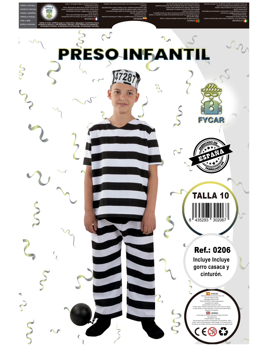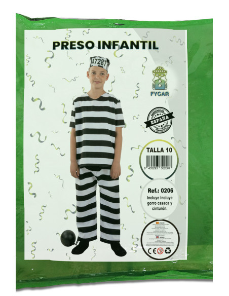 Disfraz preso infantil para castigar a los más gamberros. Perfecto para disfraces en grupo y Carnaval. Incluye gorro, camiseta y pantalón.