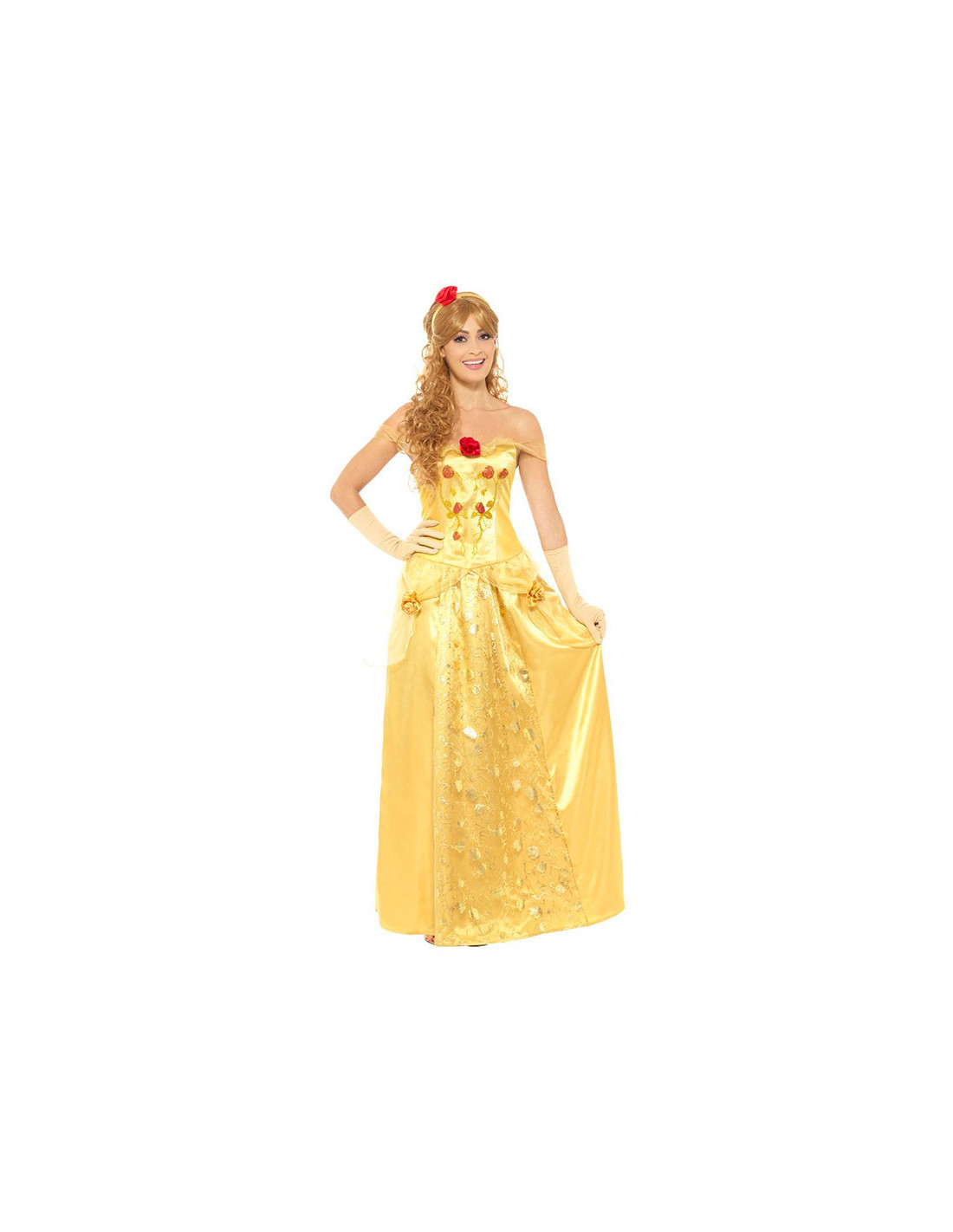 Este completo disfraz princesa dorada para mujer contiene un vestido largo con guantes a juego y diadema con rosa roja.