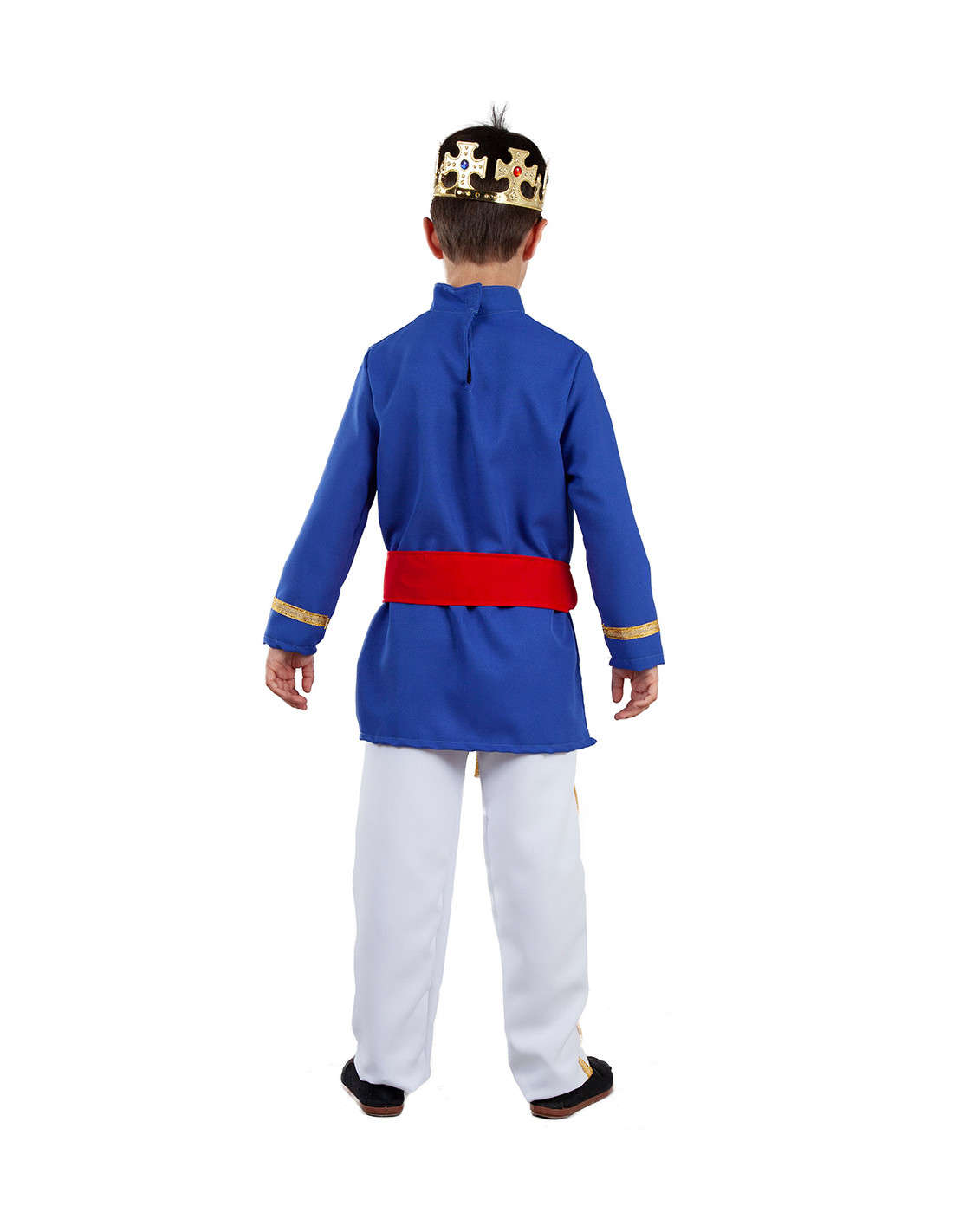 El disfraz príncipe azul infantil contiene una camiseta larga con detalles dorados en hombros, mangas y botones simulados, pantalón blanco con cinta dorada en un lateral y cinturón rojo con terminación en fleco dorado.