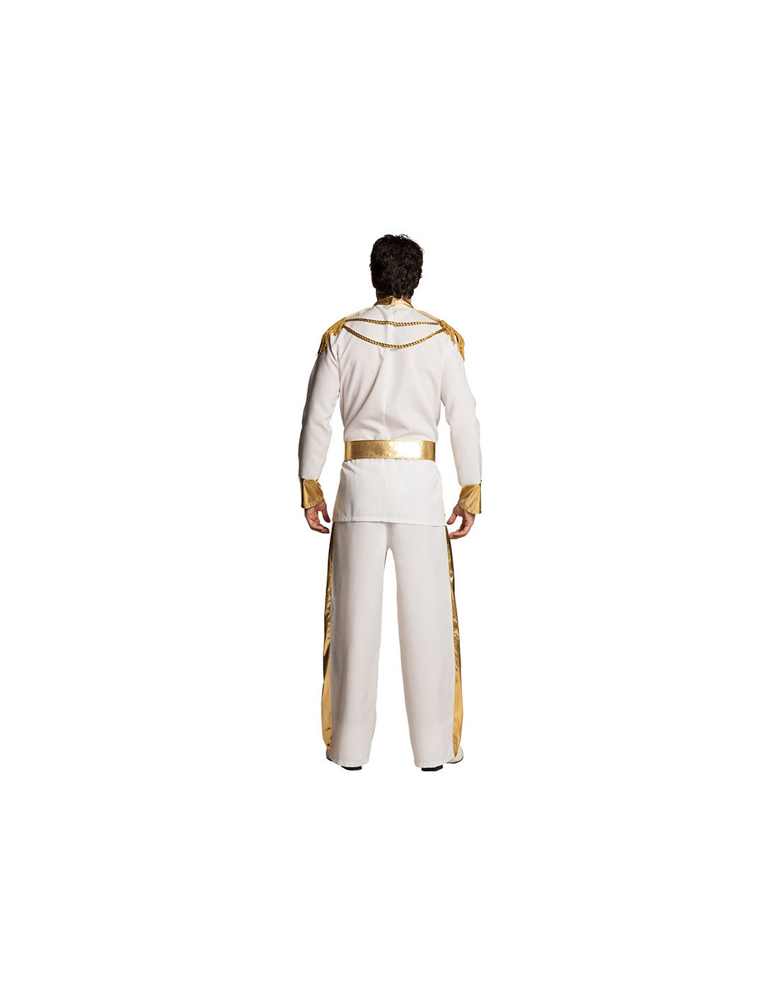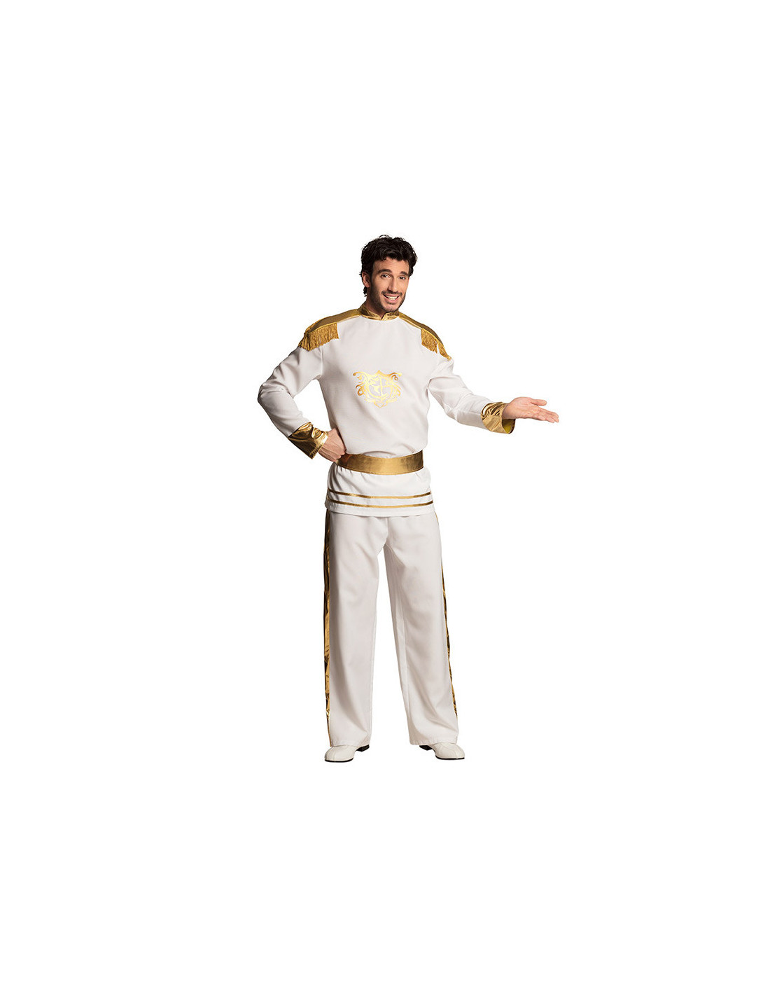 El disfraz príncipe de cuento para hombre contiene una casaca, pantalón y cinturón; todo ello en tonos blancos y dorados.