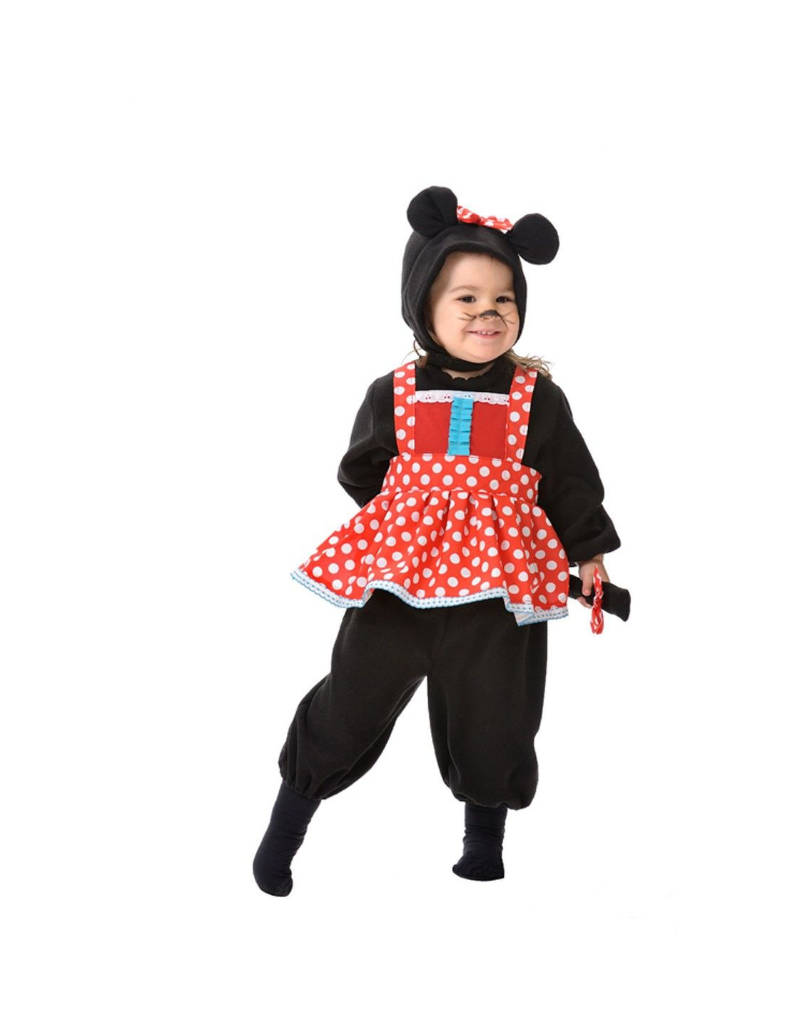 Convierte a tu pequeña en Minnie con este disfraz de ratita para bebé. Incluye cabeza, mono y delantal