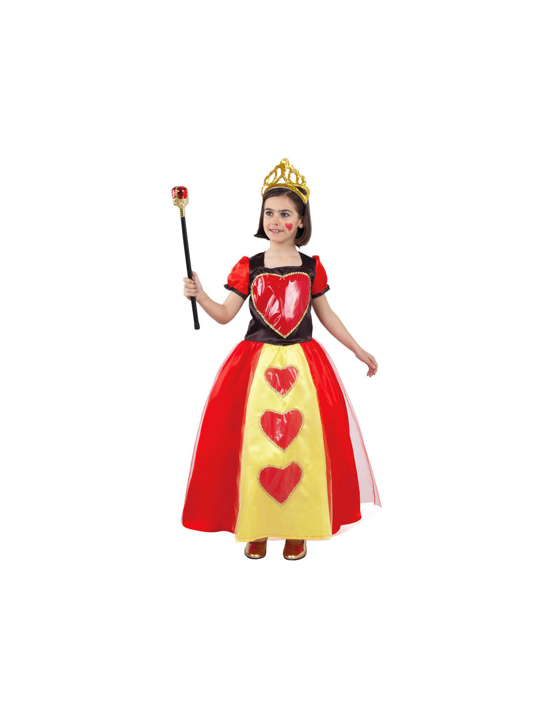 Disfraz reina de corazones niña con el que se convertirá en una de las reinas más despiadadas del universo fantástico. Incluye un elegante disfraz reina de corazones niña, compuesto por un vestido en color rojo, negro y amarillo, con corazones a lo largo de la parte central.