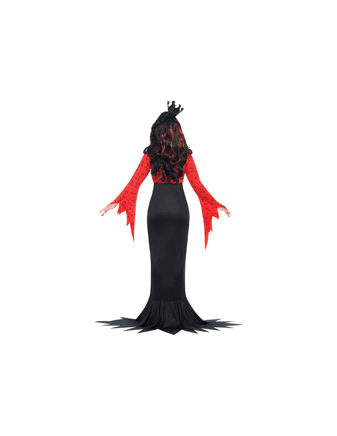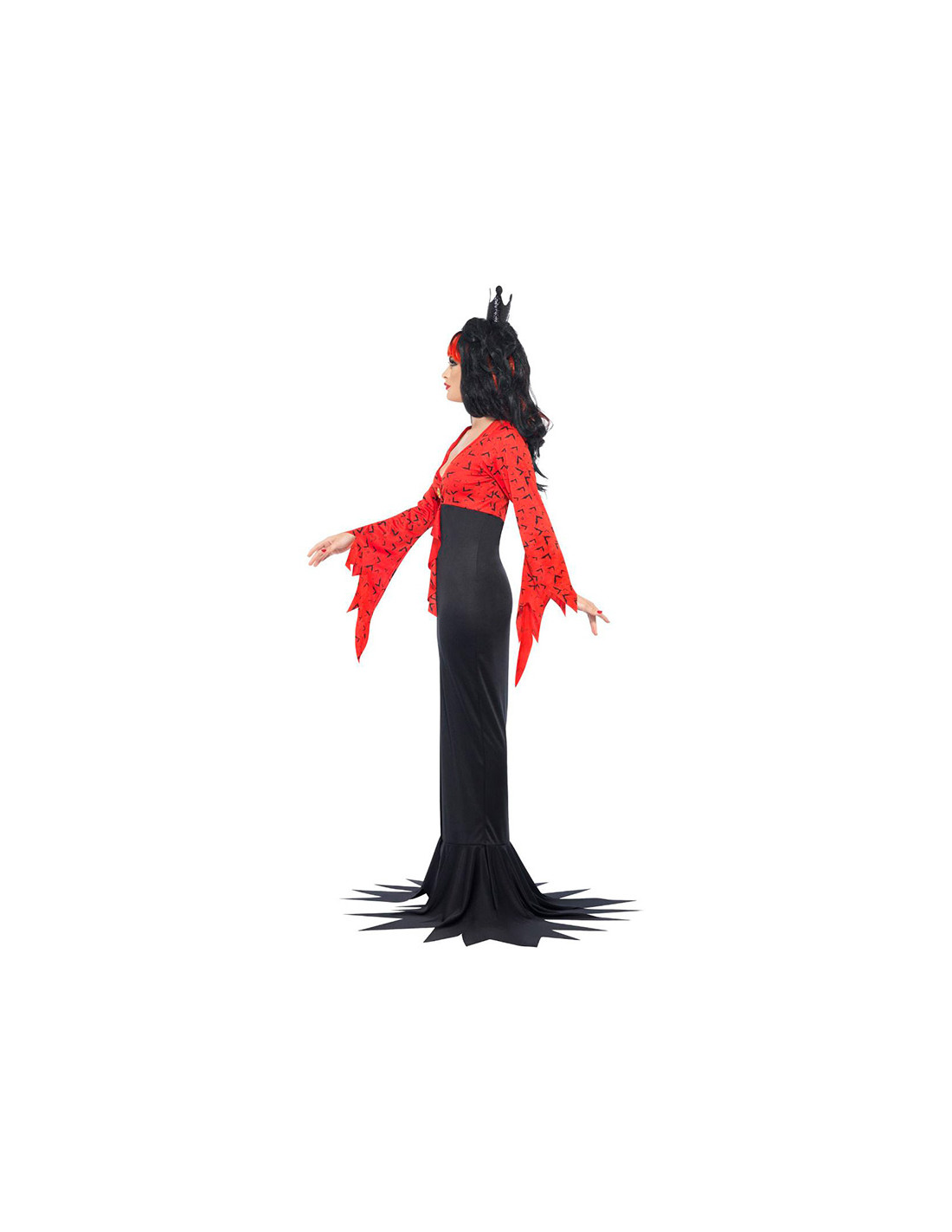 El disfraz contiene un precioso vestido largo con terminaciones en picos. La parte superior es roja con estampado de murciélagos y un detalle en el escota. La parte de la falda tiene una abertura que le dará un toque muy sexy a tu disfraz. Combínalo con una corona gótica, y un precioso colgante.