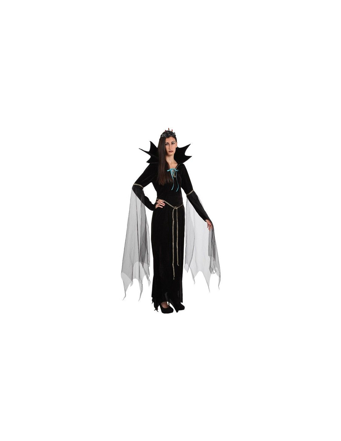 Disfraz Reina Malvada, que incluye: Vestido negro de terciopelo un poco elastico, con cuello de vampiro y tul en las mangas.