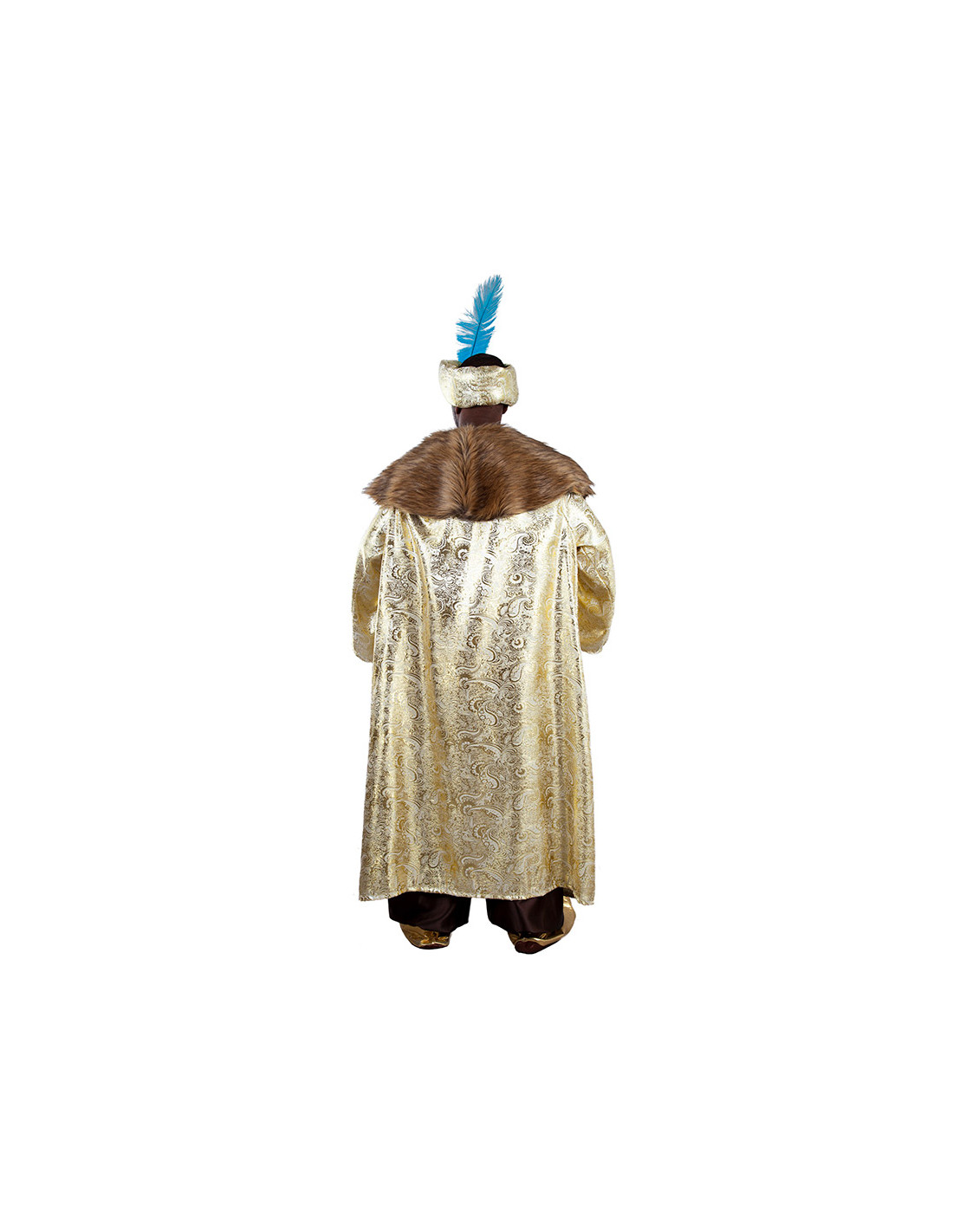 El disfraz Rey Mago Baltasar adulto contiene un abrigo brocado en tonos dorados, mangas y cordón para anudar al cuello. Una capelina de pelo largo marrón con mucho brillo y tacto agradable. La casa es de raso rematada con pasamanería dorada en el cuello y el pantalón también es de raso en un tono más oscuro, con goma en los tobillos para dar un efecto bombacho. Incluye además un cinturón brocado con la misma tela que el abrigo con terminación en fleco.