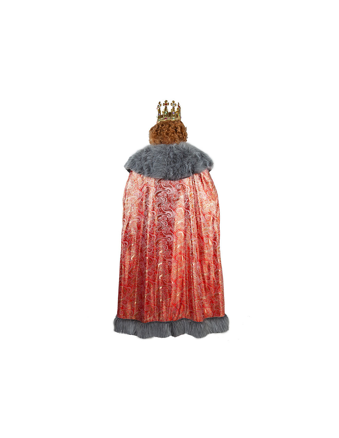 El disfraz Rey Mago Gaspar adulto contiene una capa roja con brocado dorado, capelina de pelo largo y agradable al tacto en color gris. Las terminaciones de la capa tienen un ribete en el mismo pelo que la capelina. Se ata al cuello mediante cordón, además dispone de dos aberturas para sacar los brazos cómodamente y tener una mejor movilidad. El cinturón es del mismo tejido brocado que la capa. Y contiene además una túnica de raso de manga larga con detalles dorados.