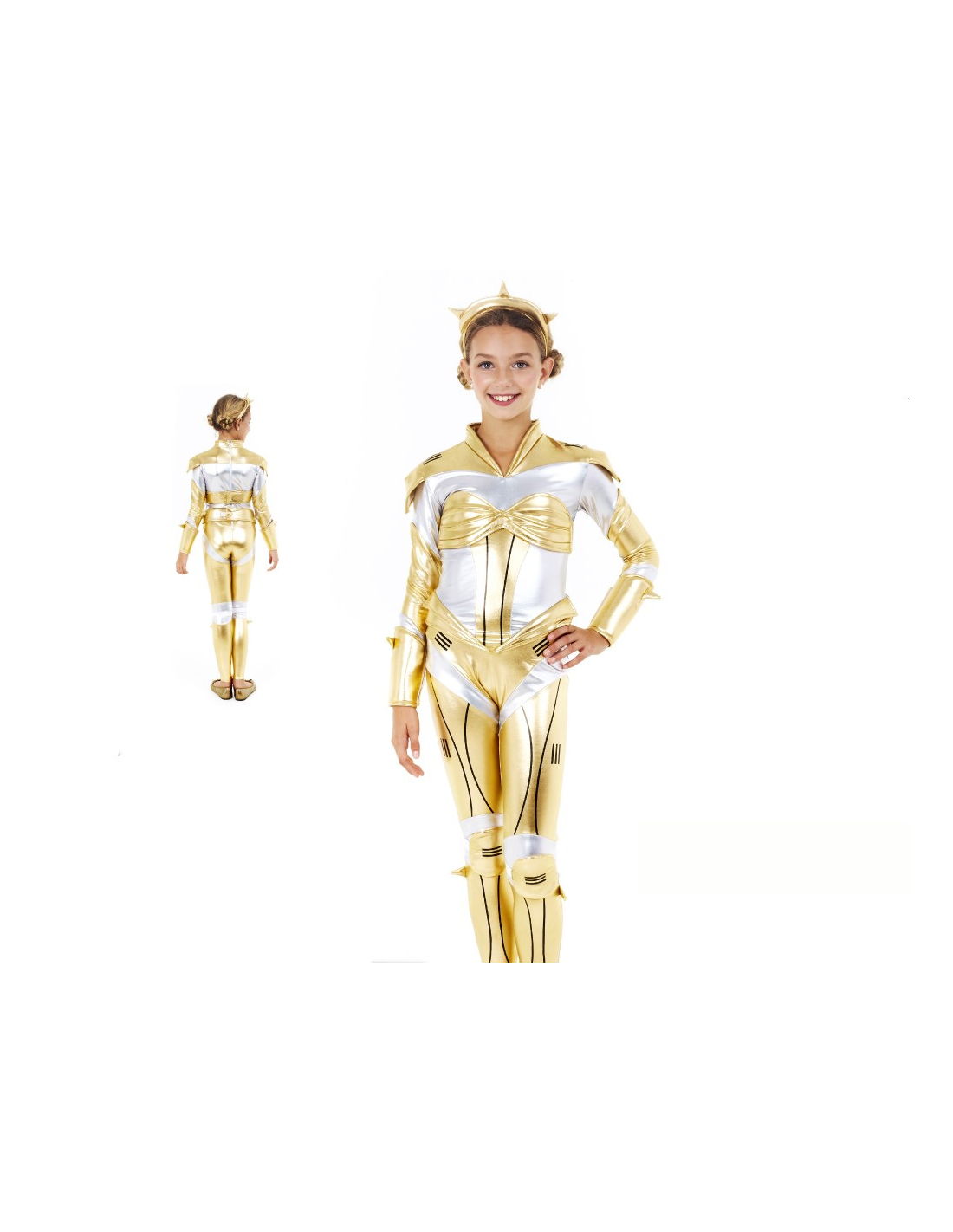 Disfraz robot dorado para niña que incluye mono, diadema, top, muñequeras y rodilleras.