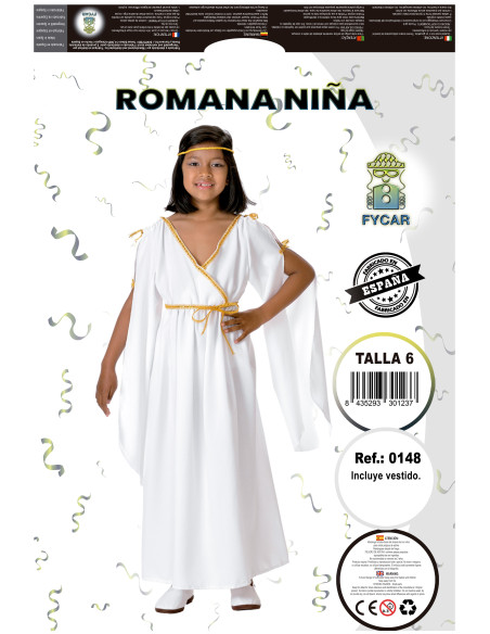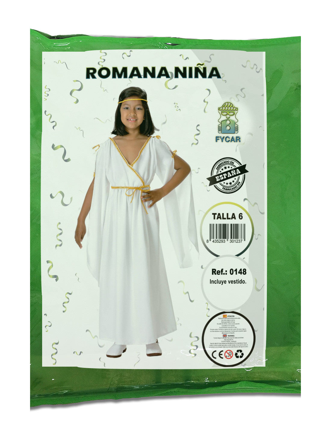 La pasamanería del traje pueden ser en color oro o plata. Incluye vestido de poliester decorado con pasamanerias. Transpórtate a otra época con este disfraz de romana, interesante para la fiesta de Lucus u otras celebraciones de romanos en muchas localidades especialmente del norte, o donde éstos dominaron con su imperio. Puedes representar con este disfraz a Mesalina la famosa envenenadora del imperio romano