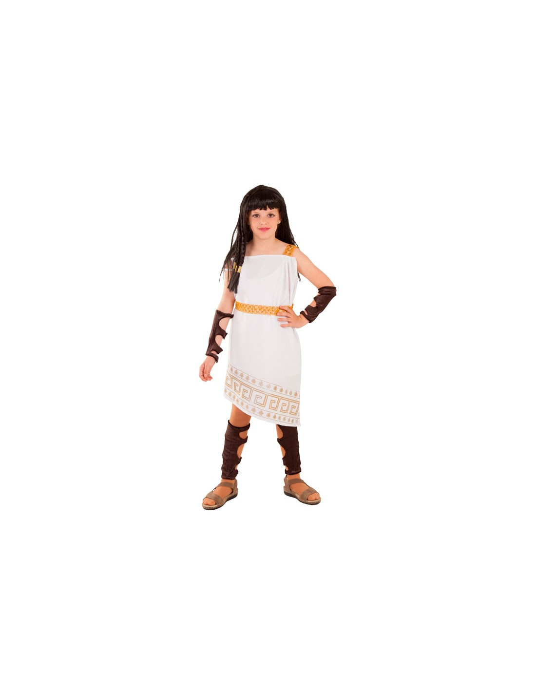 Este disfraz romana Patricia niña que contiene vestido blanco con pasamanería y estampación dorada, cinturón dorado, muñequeras y espinilleras.