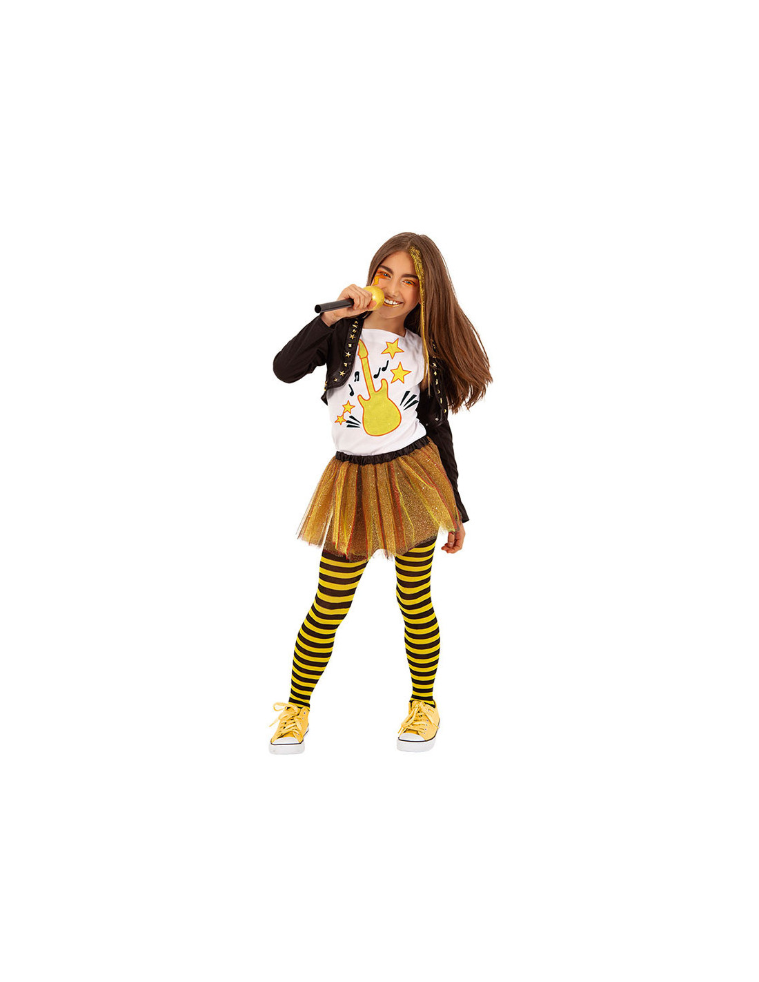 El disfraz Roquera Roxy para niña contiene una torera con tachuelas, camiseta de tirantes estampada, falda tutú con purpurina, medias a rayas y micrófono.