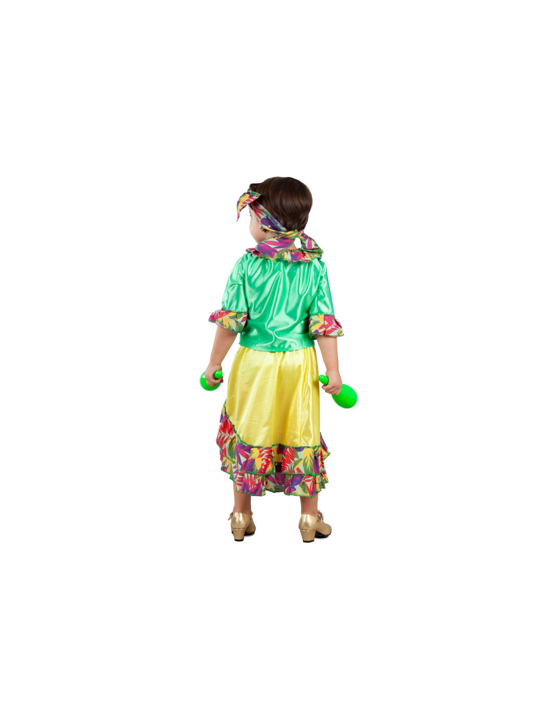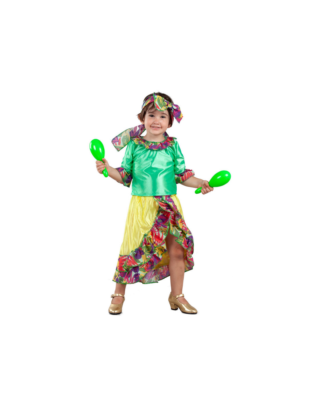 El disfraz rumbera para bebé contiene un top verde de manga corta con volantes, una falda amarilla asimétrica con abertura delantera y volantes, y un lazo para la cabeza con el mismo estampado que los volantes.