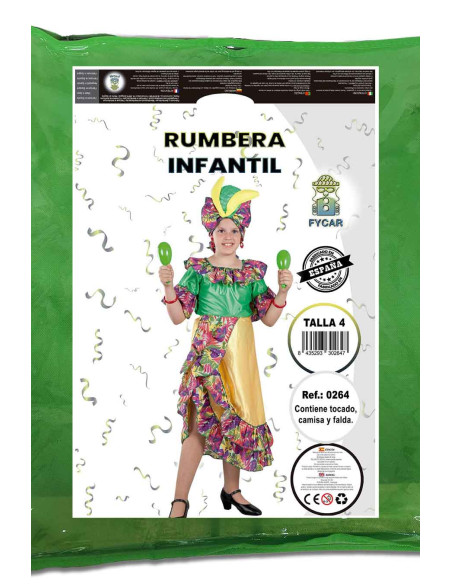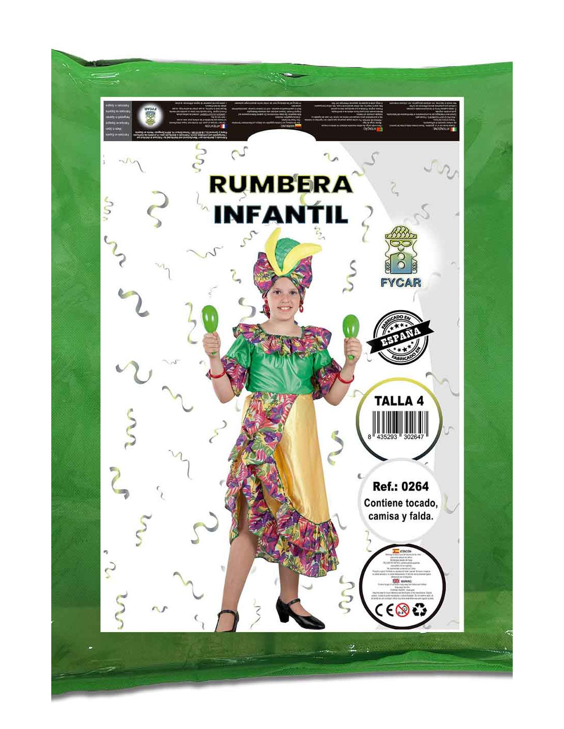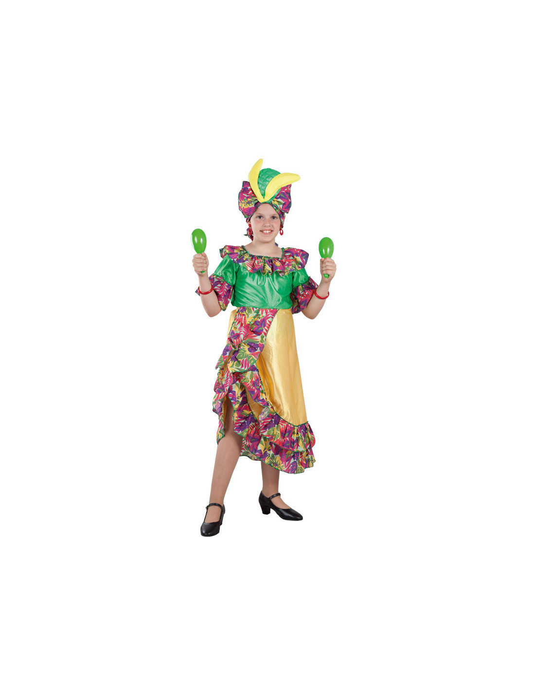 Disfraz rumbera para niña que incluye tocado, camisa y falda.
