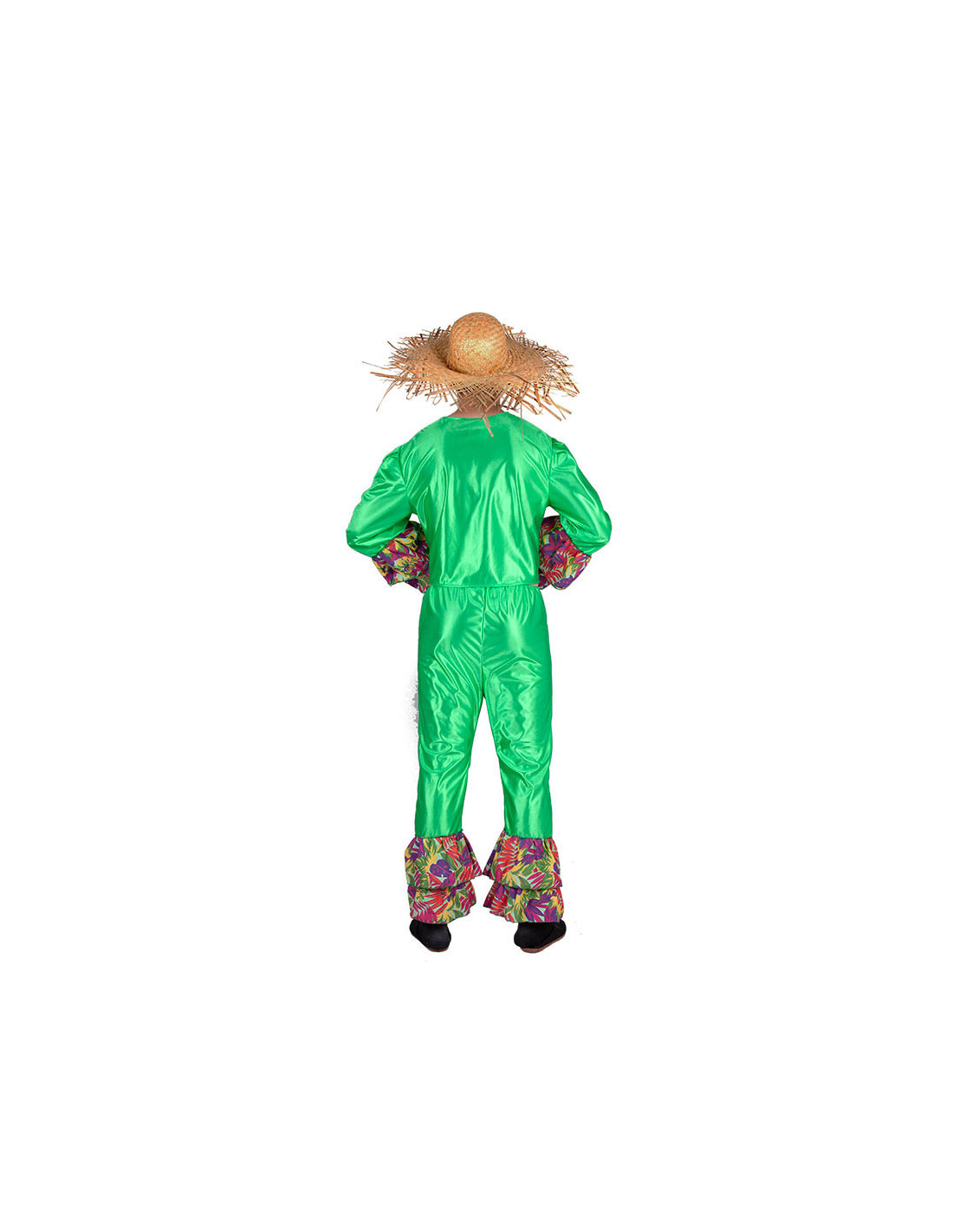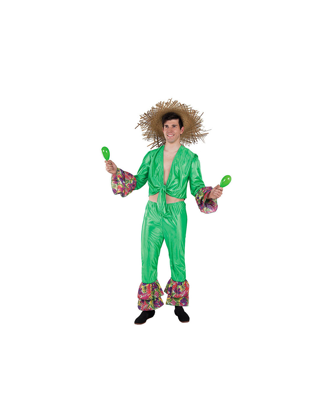 El disfraz rumbero hombre contiene una camisa verde para anudar en la parte frontal y manga larga con volantes, también incluye un pantalón verde con goma elástica en la cintura y volantes en los bajos.