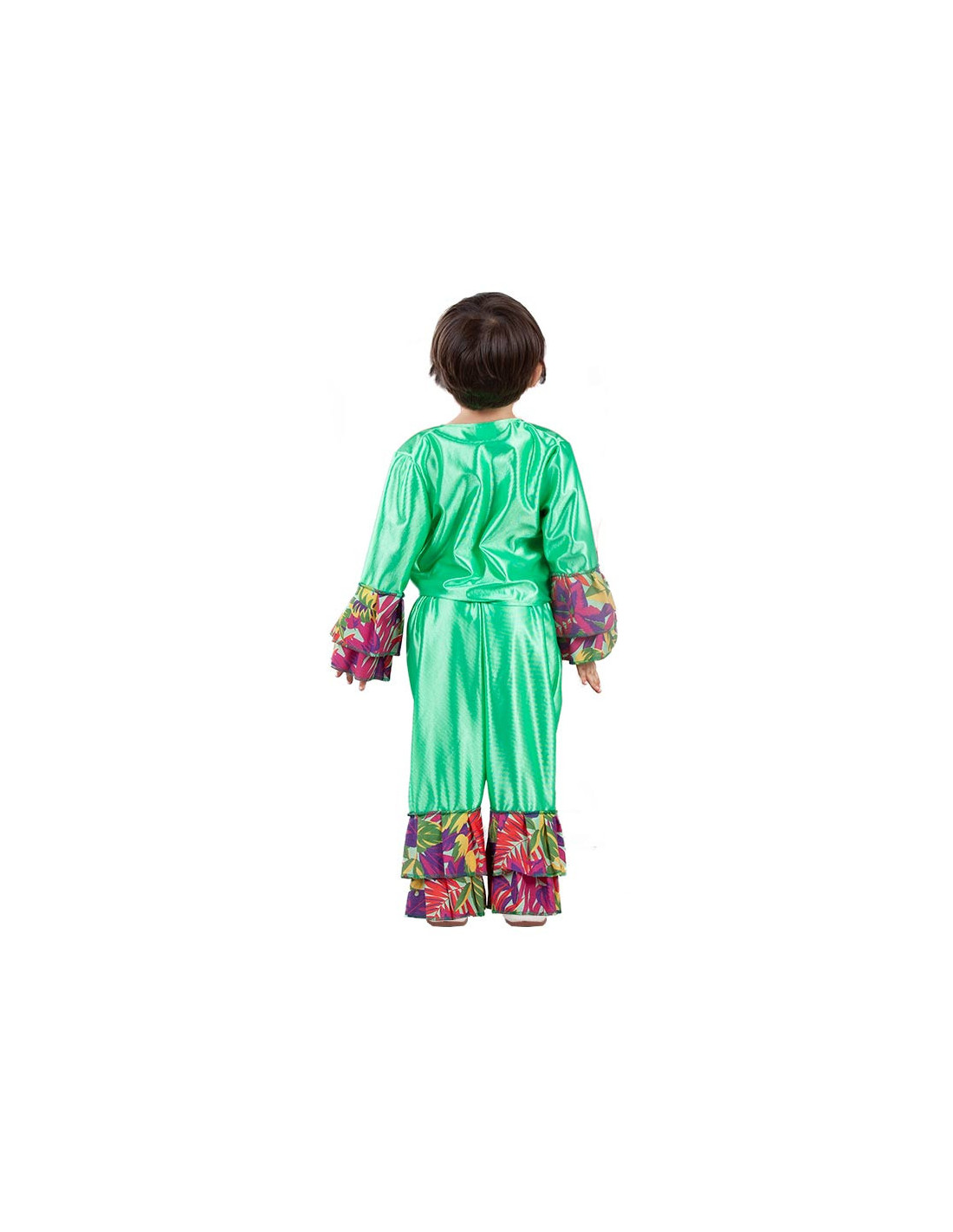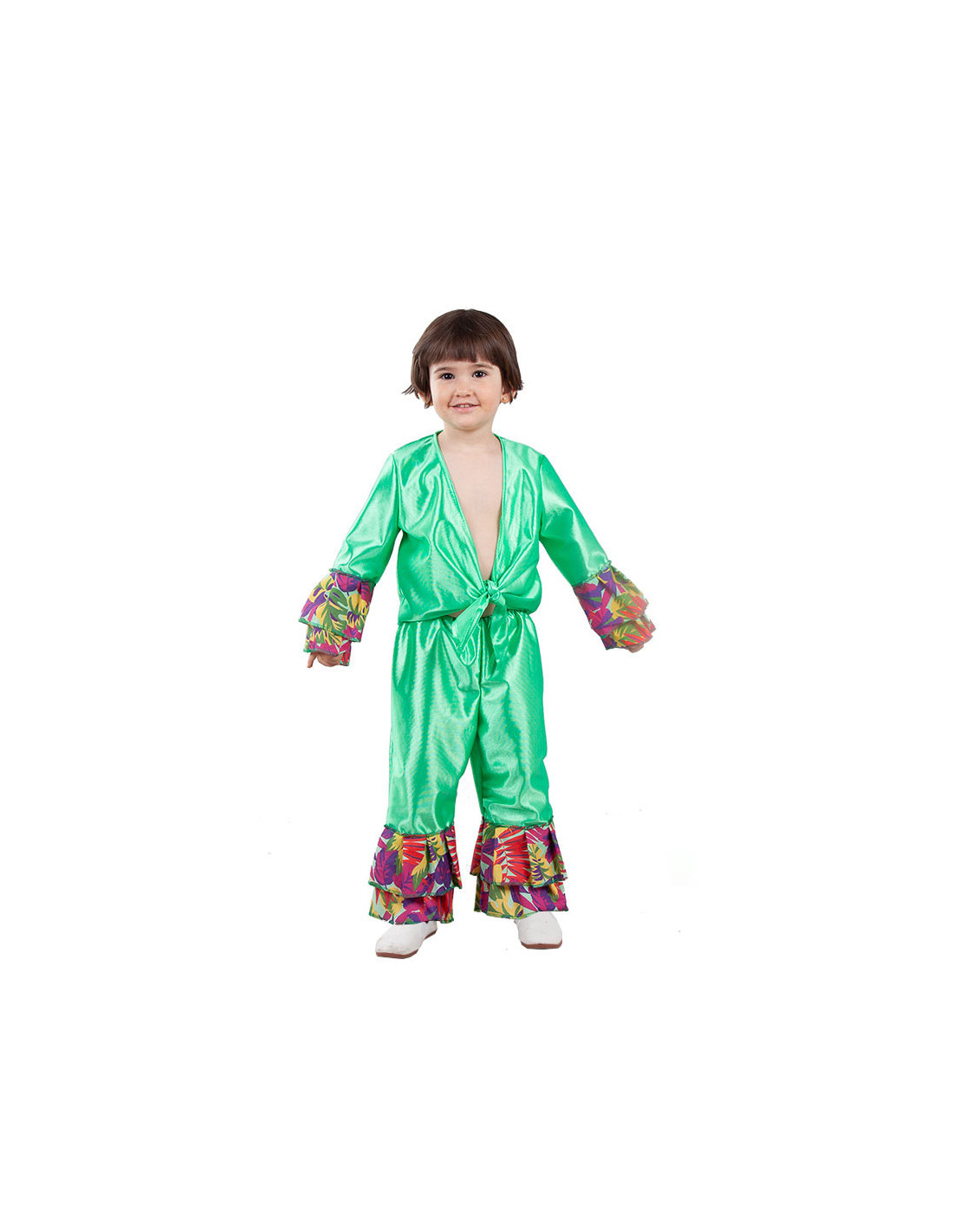 Disfraz rumbero para bebé niño contiene una camiseta de manga corta abierta por delante para hacer un nudo, y un pantalón con goma elástica en la cintura. Todo ello es de color verde y con unos coloridos volantes.