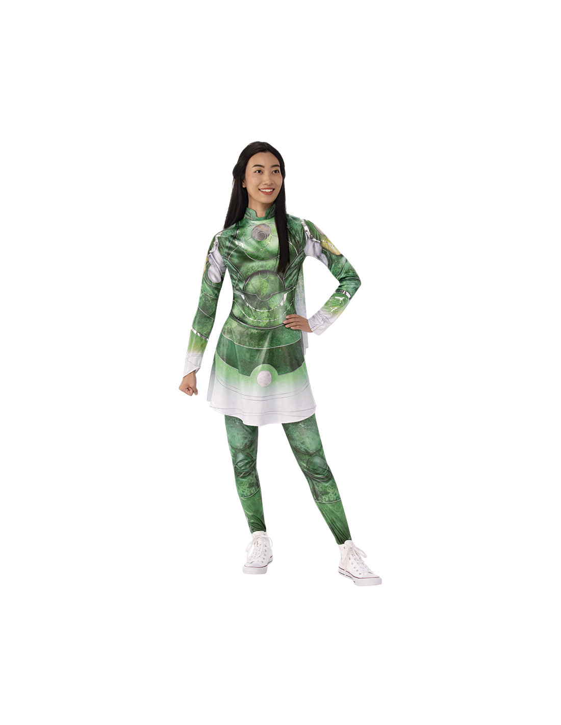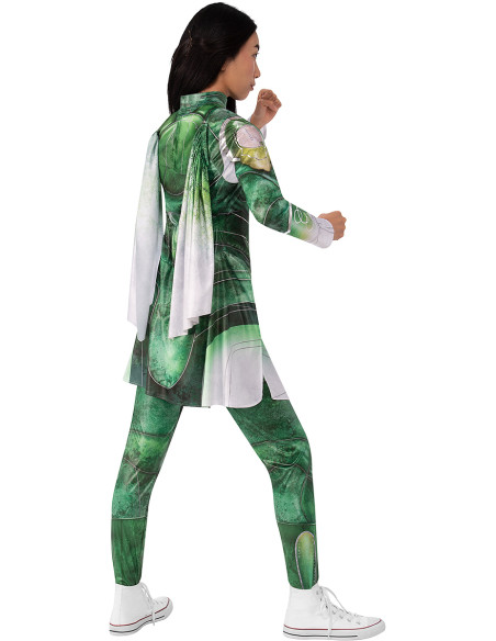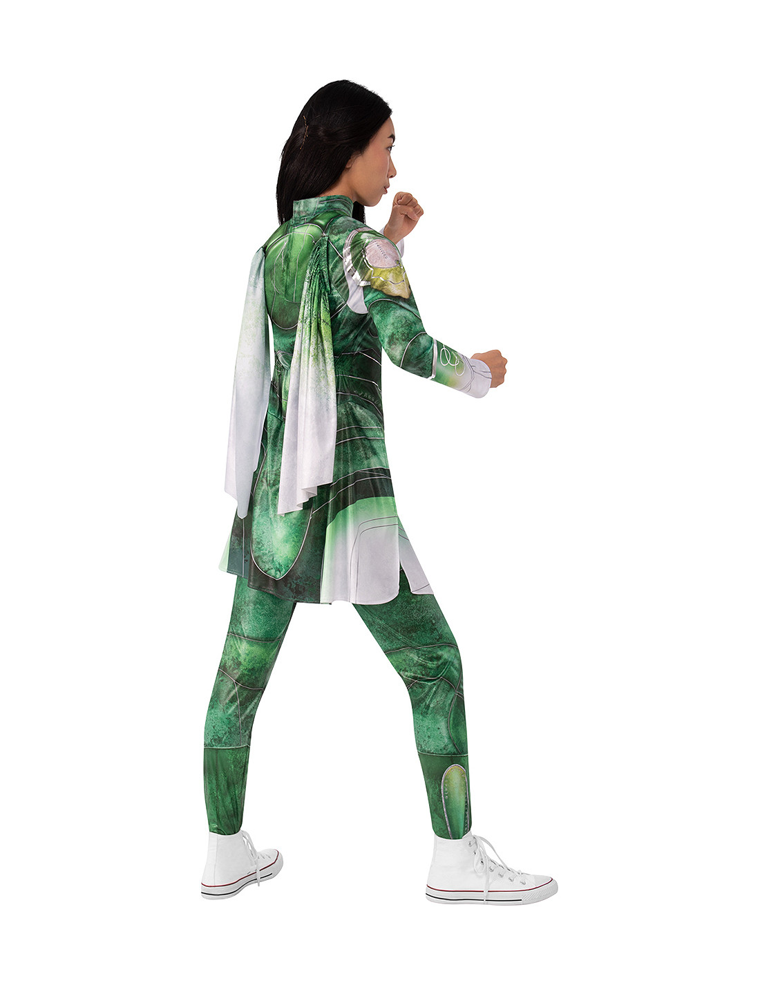 ¿Quieres convertirte en una auténtica superheroína? Ya puedes transformarte en Sersi de Eternals con esta túnica impresa digitalmente en un nuevo material brillante en tonos verde y blanco con detalles plateados en el pecho y los hombros. Pantalones impresos digitalmente a juego de la túnica y cubrebotas. Zapatos no incluidos.