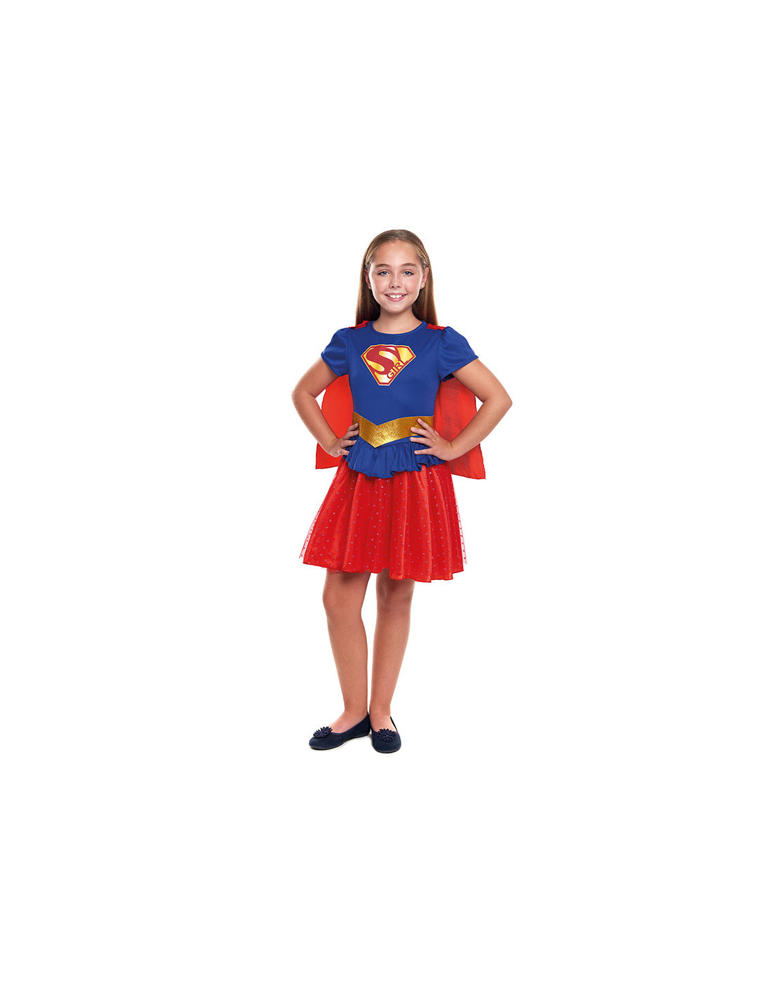 El disfraz Super Girl infantil contiene un vestido compuesto por una camiseta azul con logotipo en el pecho y acabado con volantes y una preciosa falda roja con tul y detalles en glitter. Además el disfraz incluye una capa corta de color rojo.