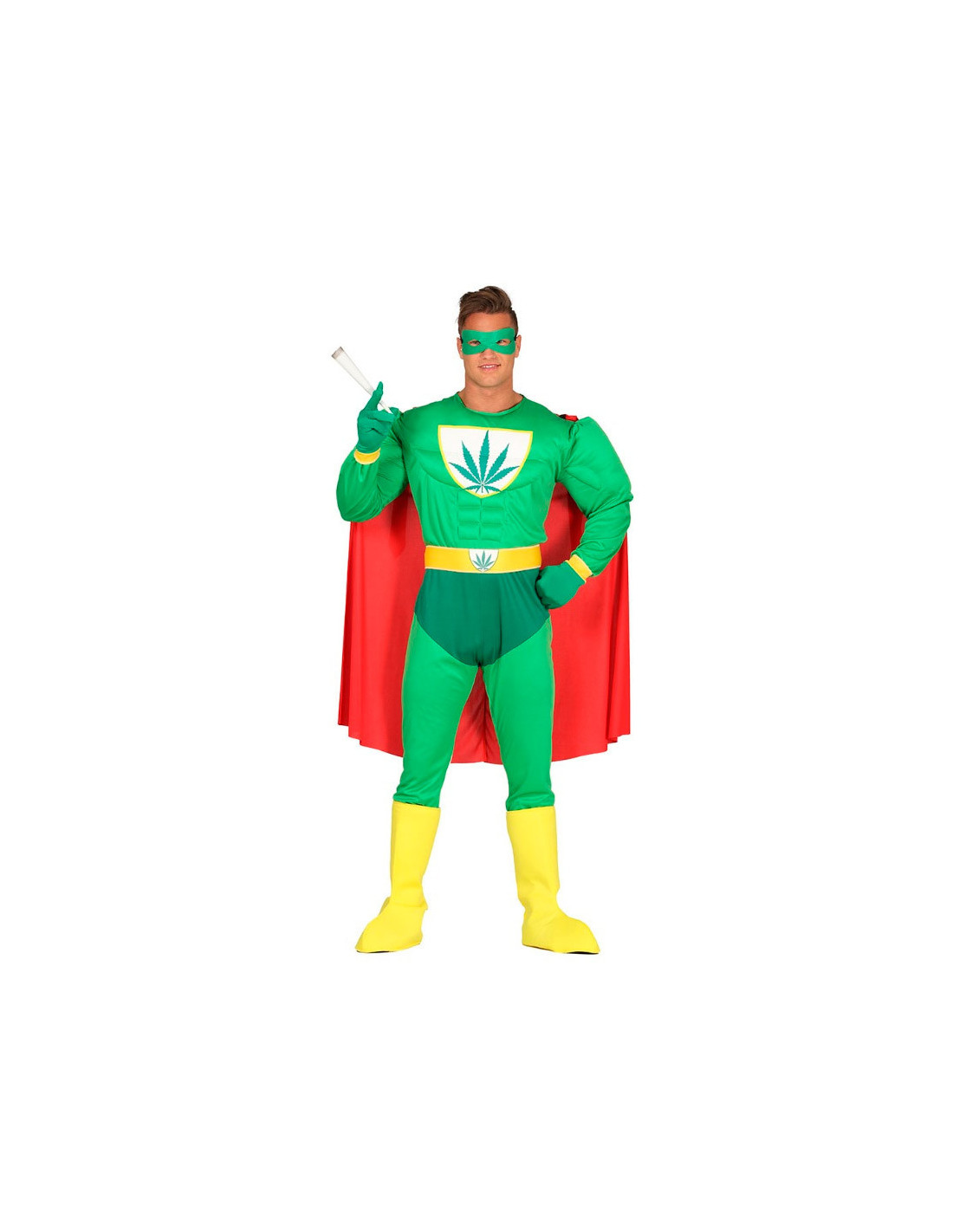 El disfraz Superhéroe Verde adulto contiene antifaz, capa, mono, guantes, cinturón.