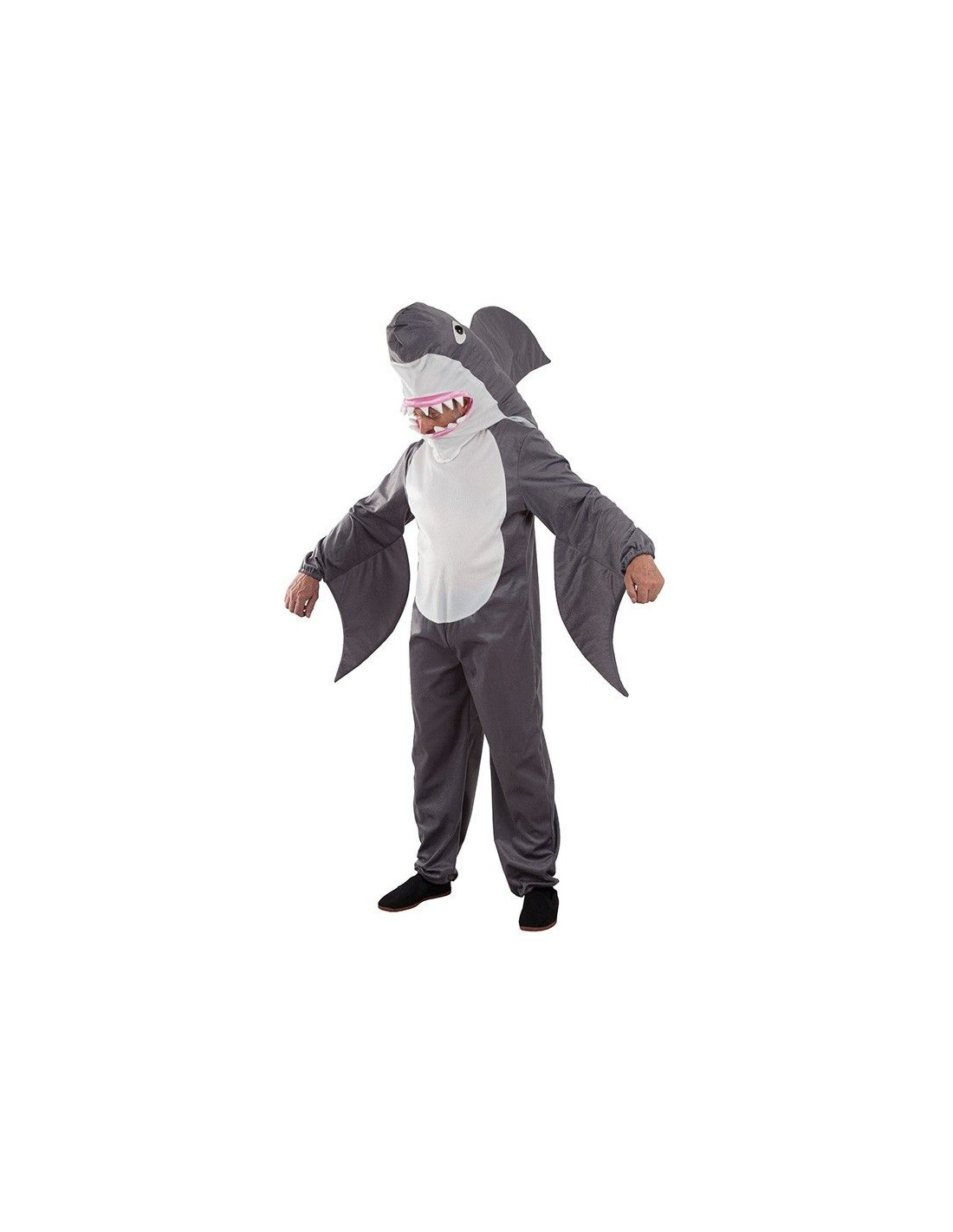 Disfraz tiburón unisex adulto que incluye mono gris con el pecho blacno y en las bocamangas las aletas y cabeza grande de color gris y blanco con los detalles de la boca con dientes, ojos y aleta dorsal. Todo el traje esta fabricado velux, un tejido de buenas calidad.