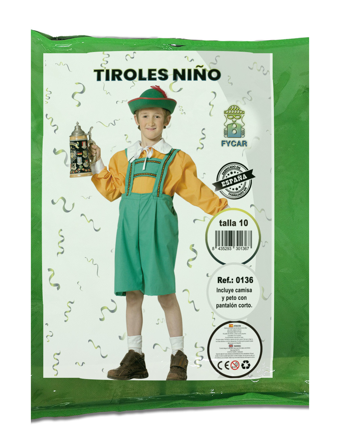 Disfraz de Tirolés infantil para que tu peque viva la cultura bávara de una manera especial o brille en el festival de fin de curso. Incluye un disfraz de Tirolés infantil, compuesto por una camisa y pantalón tipo peto como los que se lucen en la cultura alemana.