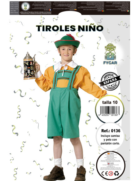 Disfraz de tirolés infantil que incluye camisa y peto con pantalón corto.