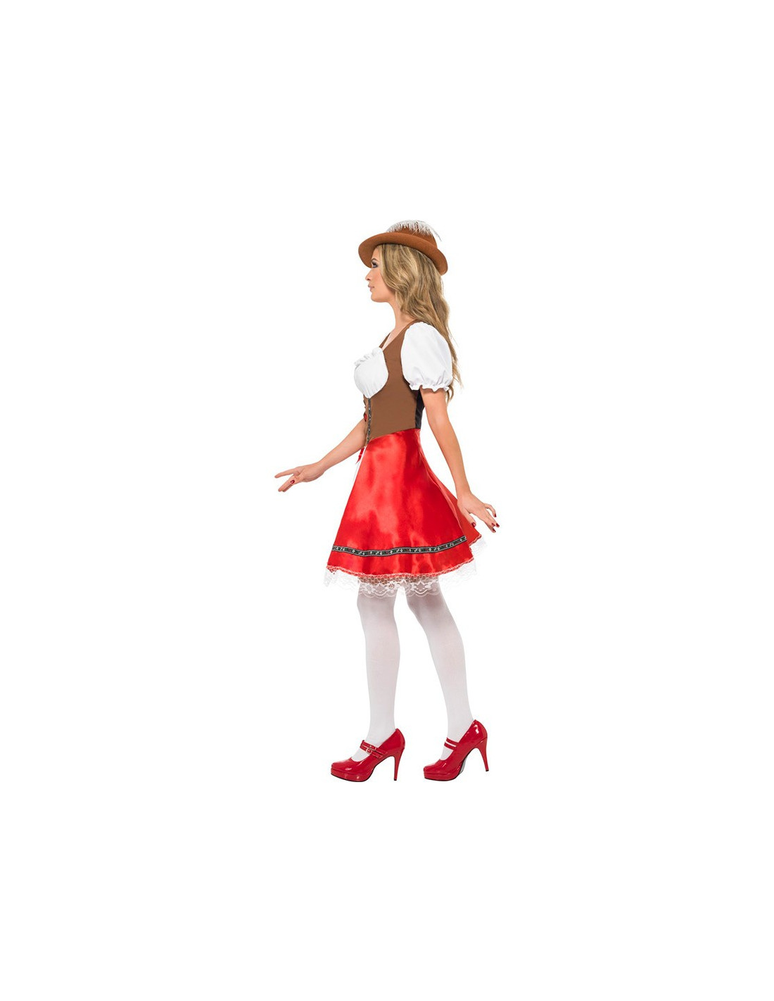 Incluye disfraz tirolesa oktoberfest para mujer que incluye vestido con falda roja, camisa blanca y corpiño marrón además de un delantal blanco acoplado.