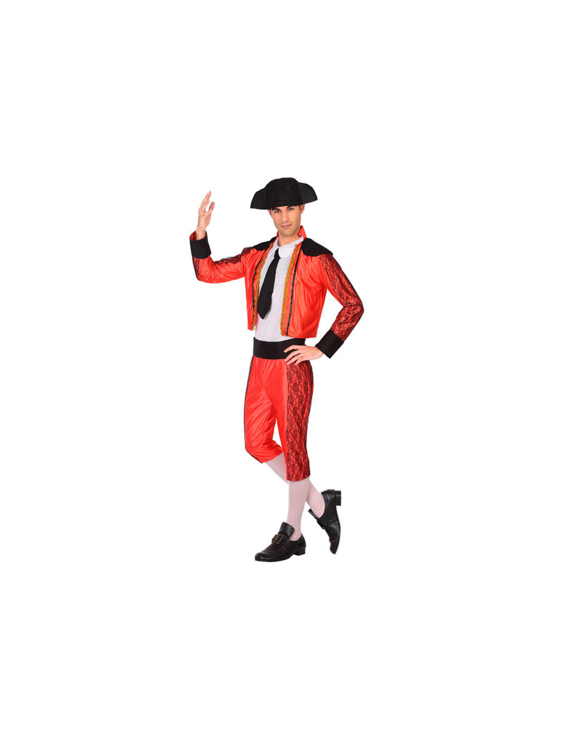 Disfraz torero rojo para hombre que incluye chaqueta, pantalón, pechero, corbata, fajín y montera.
