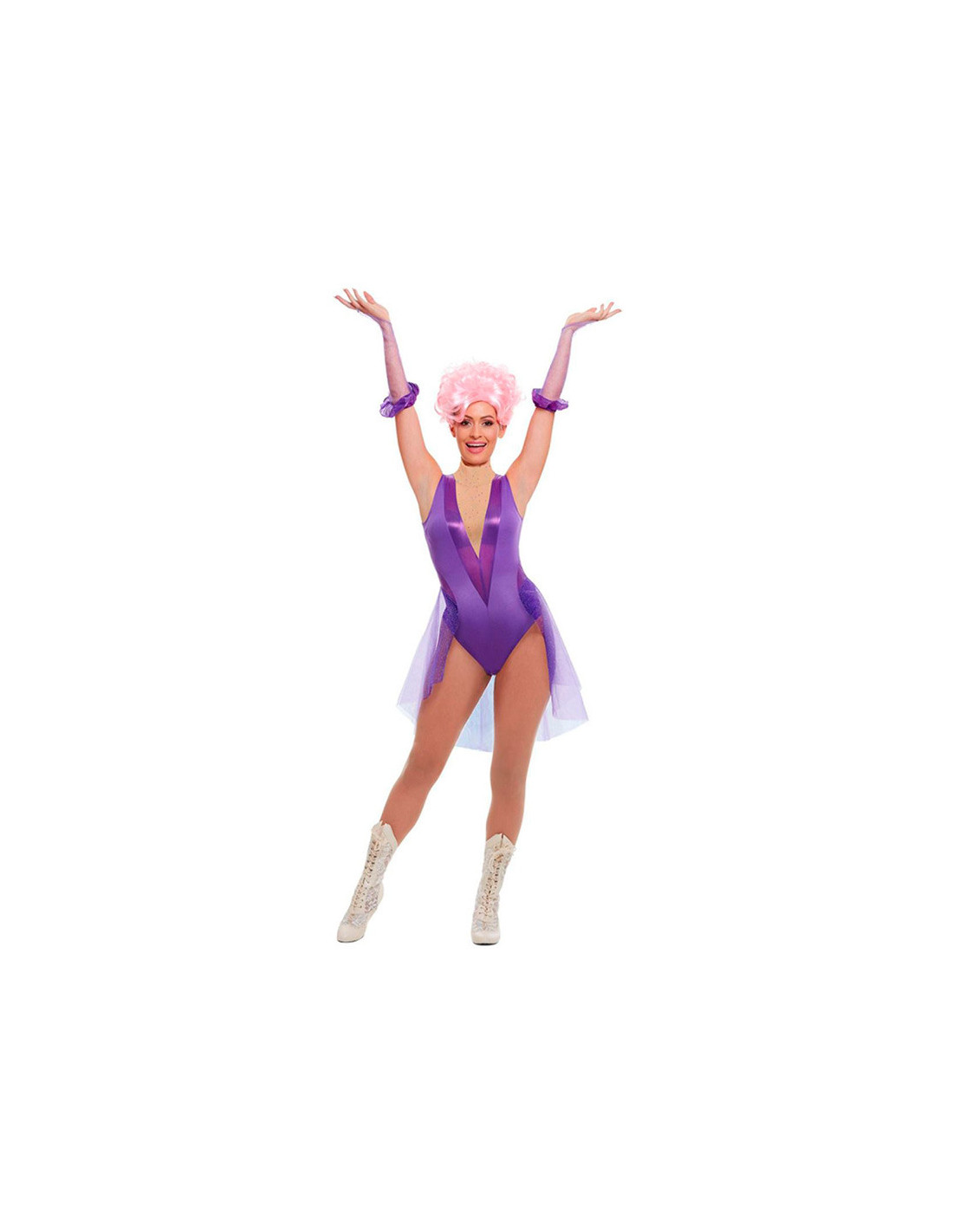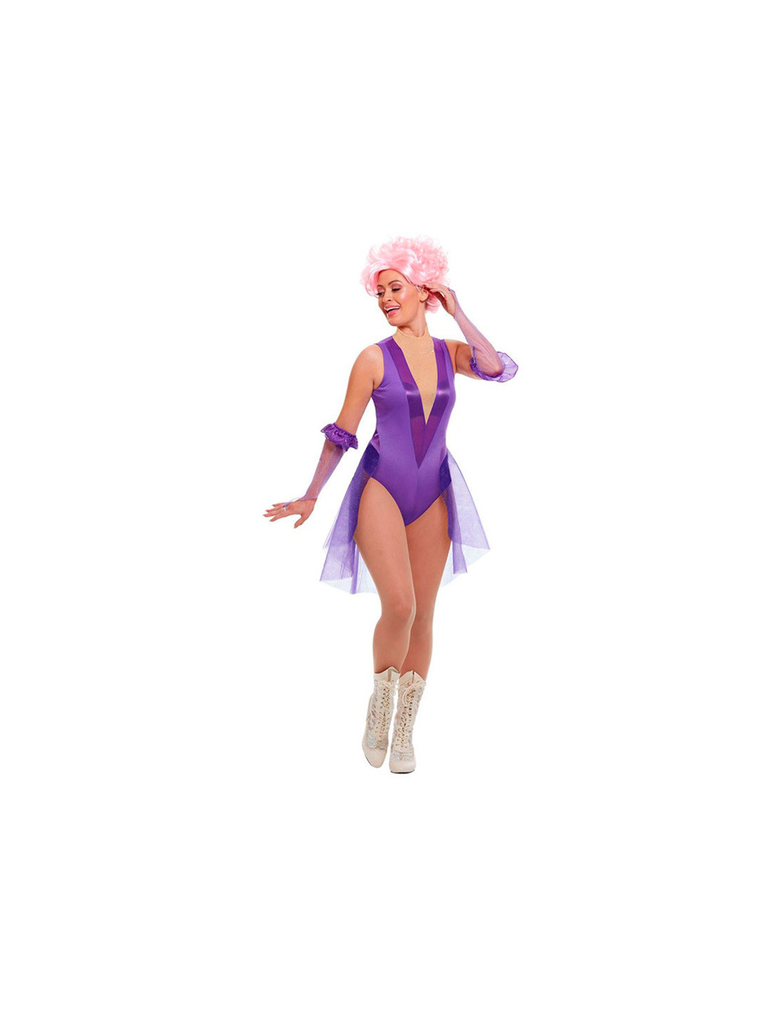 El disfraz trapecista de circo para mujer contiene un body morado sin mangas, tul en la cintura y parte posterior, y tela color carne en el escote. Además incluye unos manguitos morados semi transparentes.