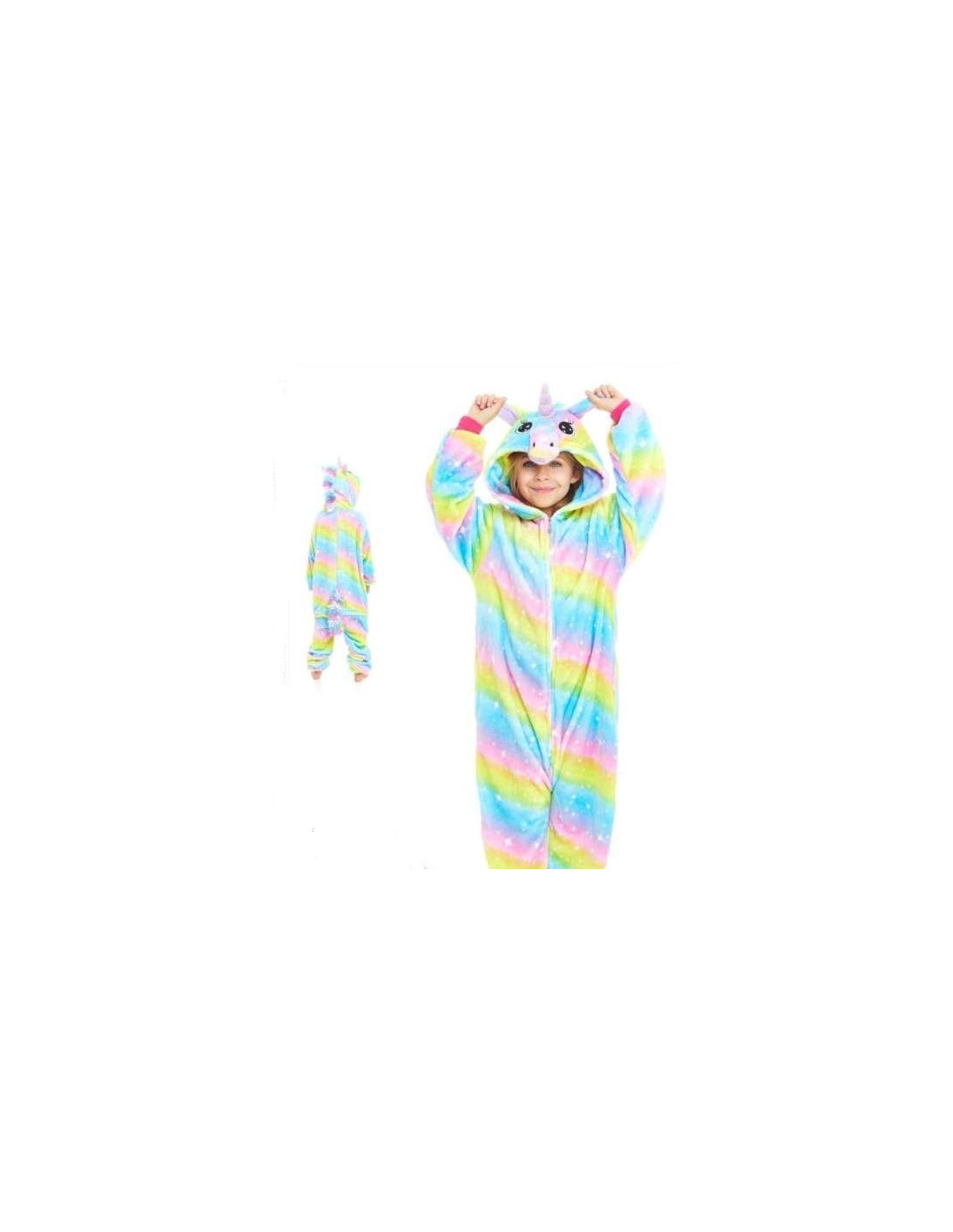 Disfraz unicornio arco iris infantil que incluye mono con capucha.