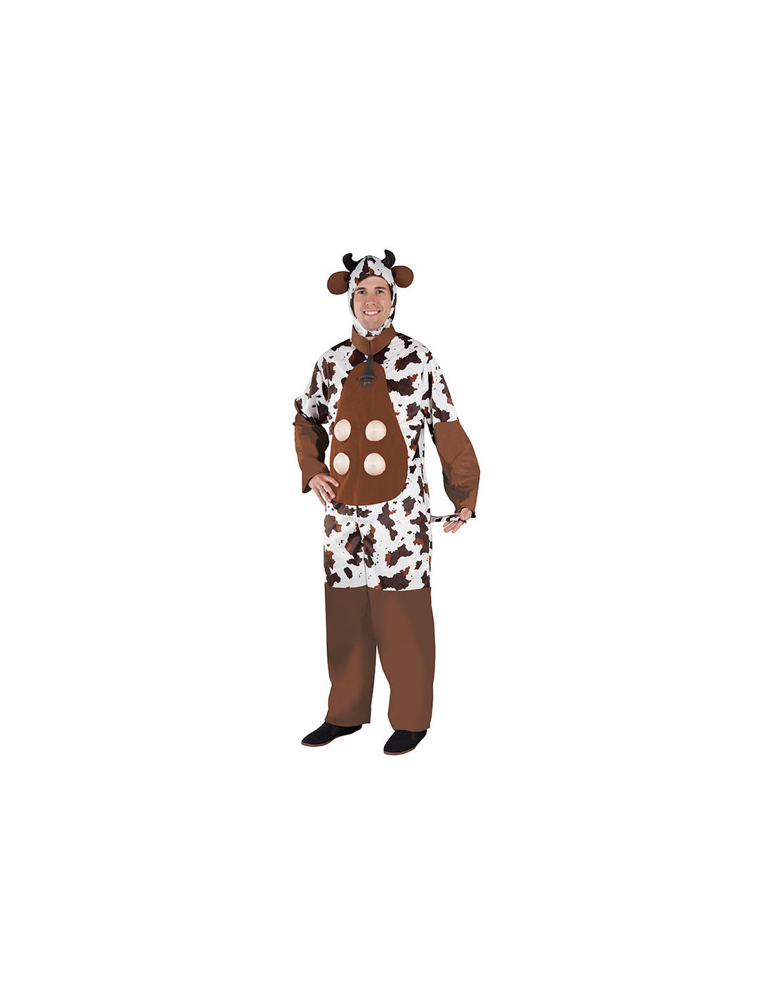 Disfraz vaca marrón para hombre que incluye gorro, cencerro y mono.