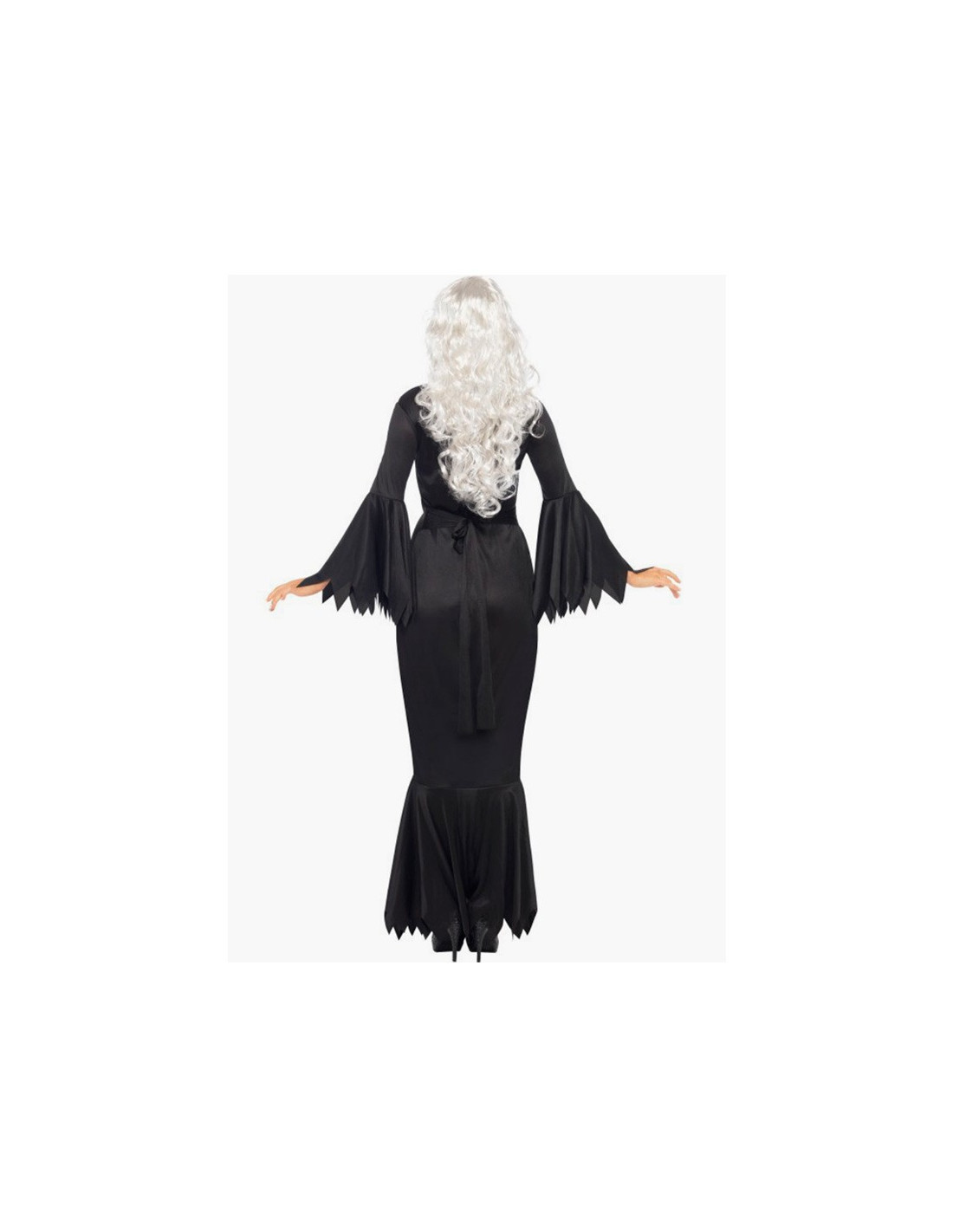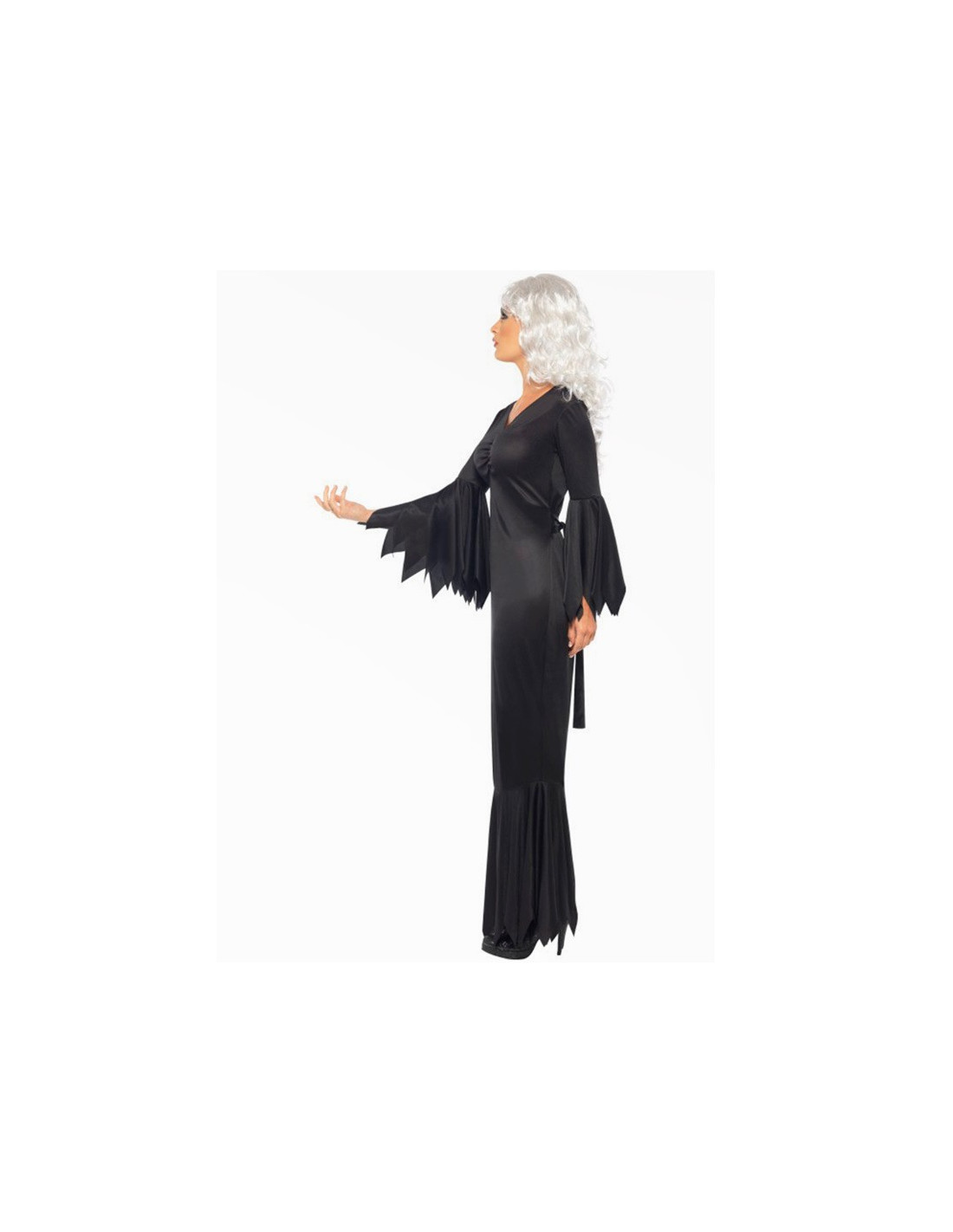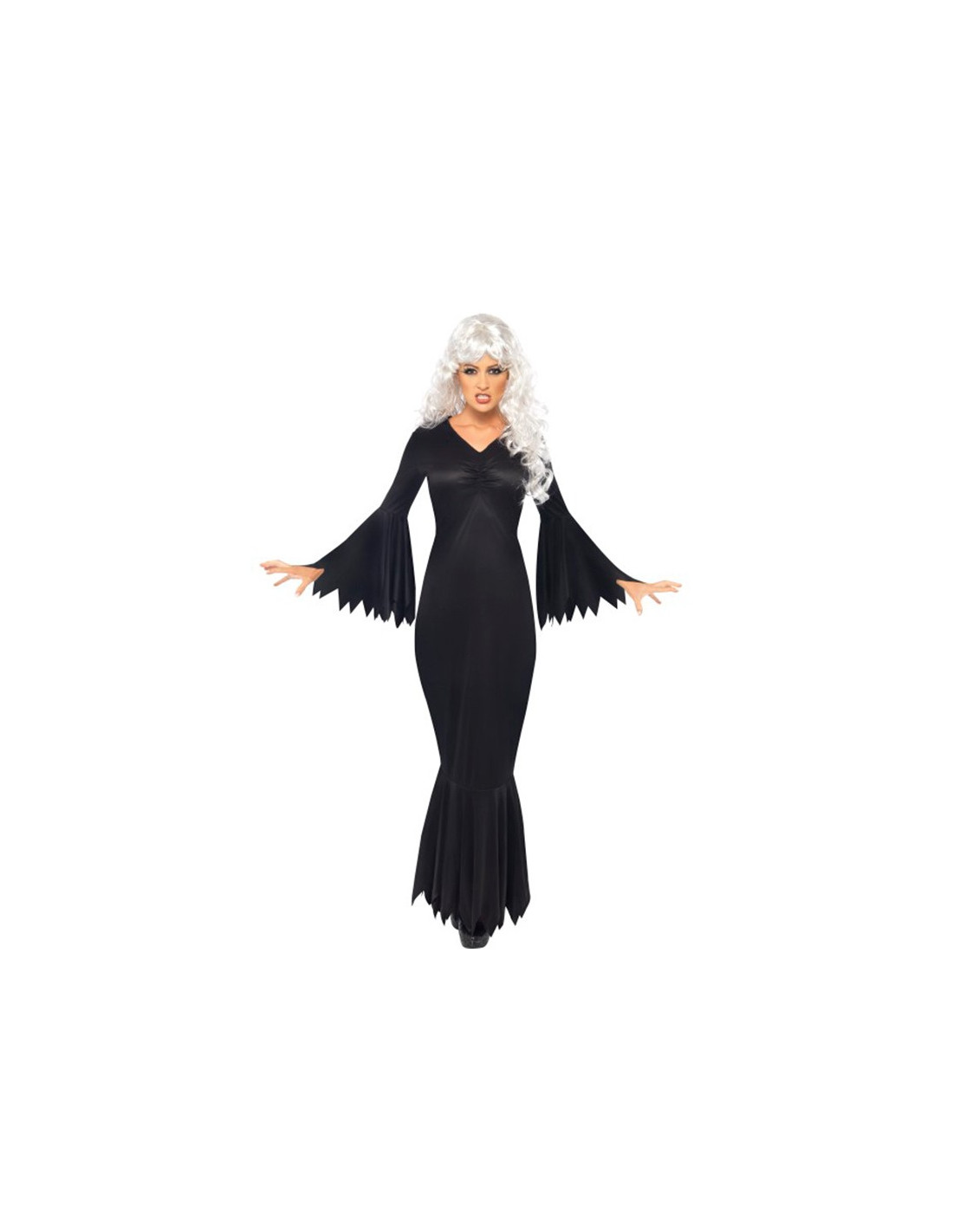 Disfraz vampira medianoche mujer que contiene un elegante vestido ajustado negro con terminaciones en pico.