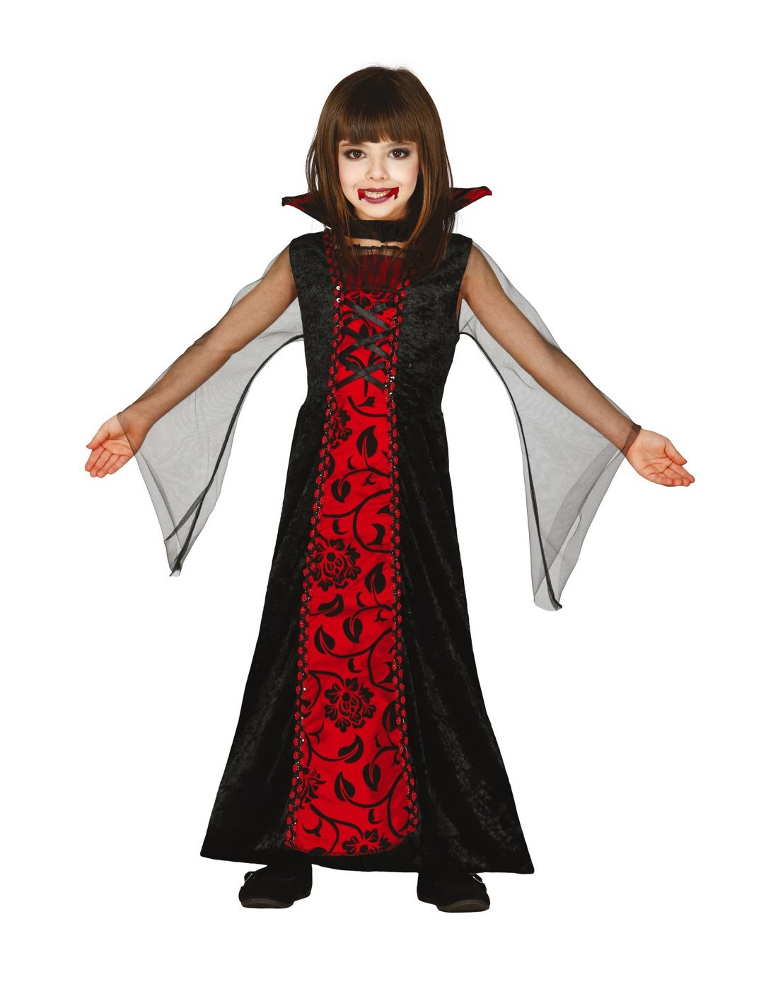 Este elegante disfraz de vampira para niña contiene un vestido negro y rojo con cuello alto.