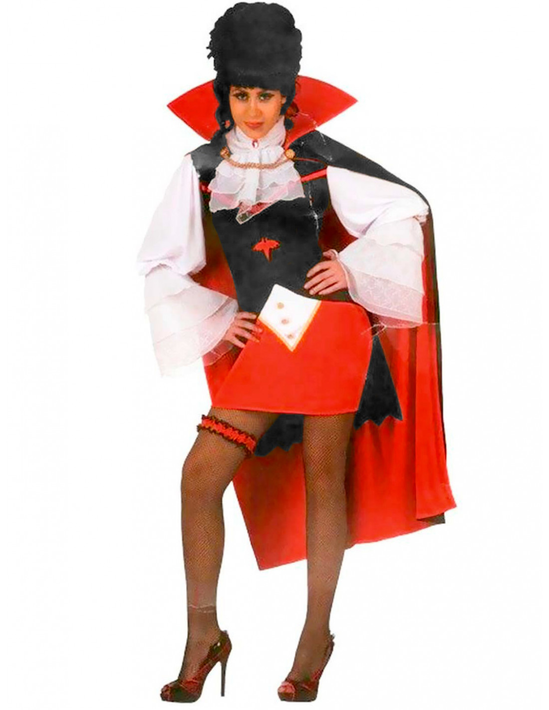 Disfraz vampira sexy, que incluye: Camisa estilo frac negro, con magas blancas largas con volantes en los puños, falda corta roja, capa negra y roja y chorreras blancas.