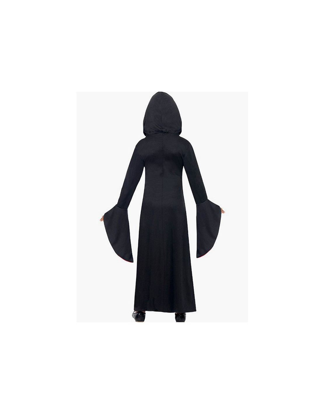 Disfraz de vampiresa niña que contiene un vestido rojo y negro con capucha y lazada en la parte frontal. No incluye calzado.