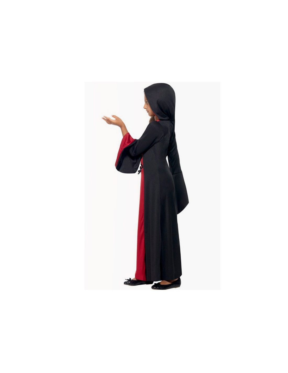 Disfraz de vampiresa para niña que contiene un elegante vestido rojo y negro con mangas anchas, capucha y una lazada en la parte frontal simulando un corsé.