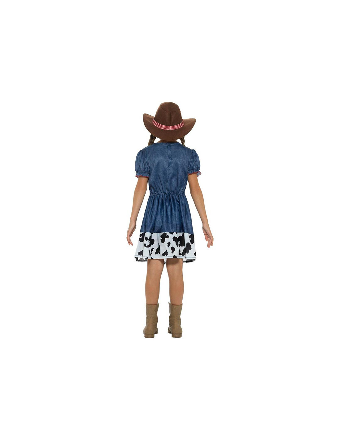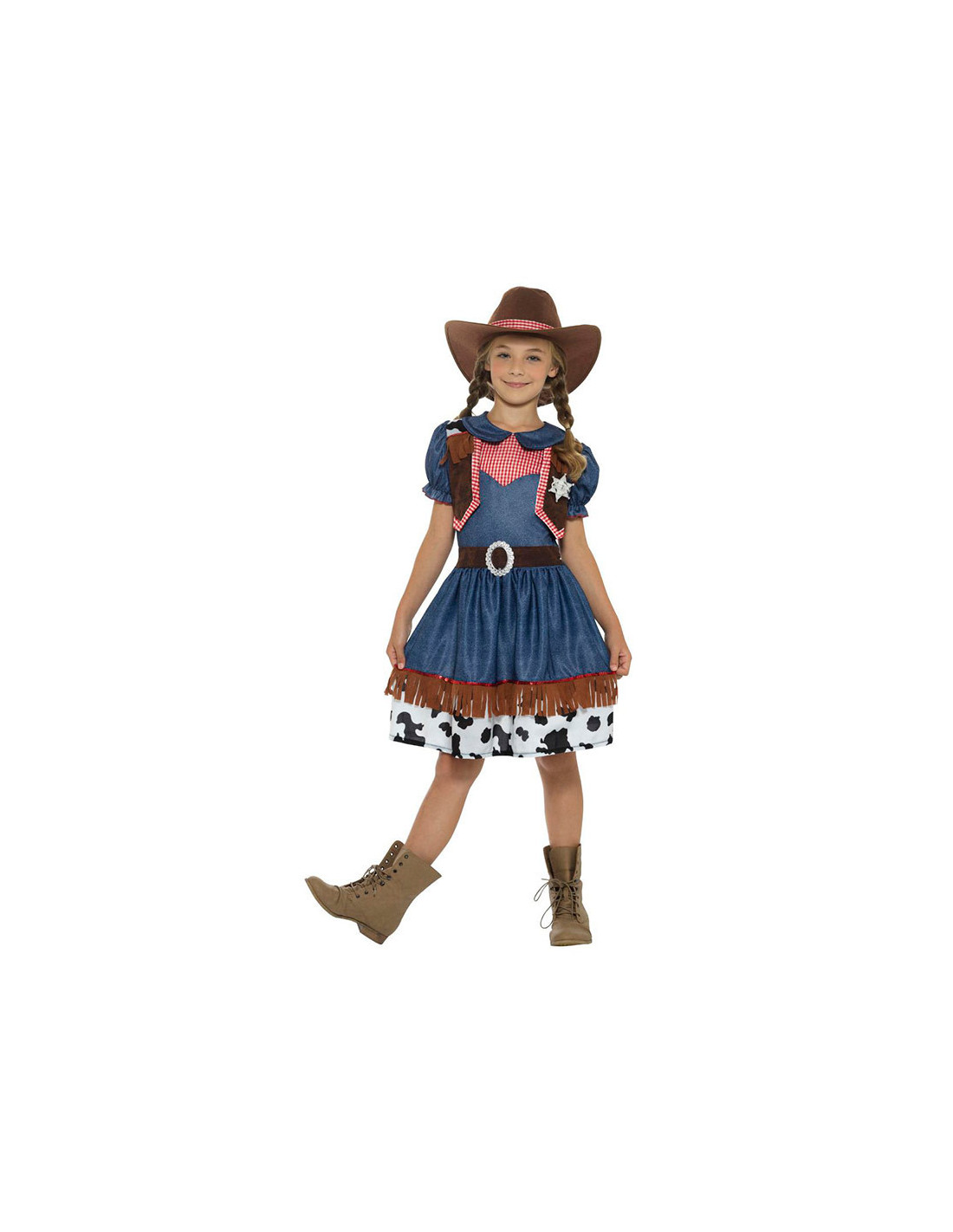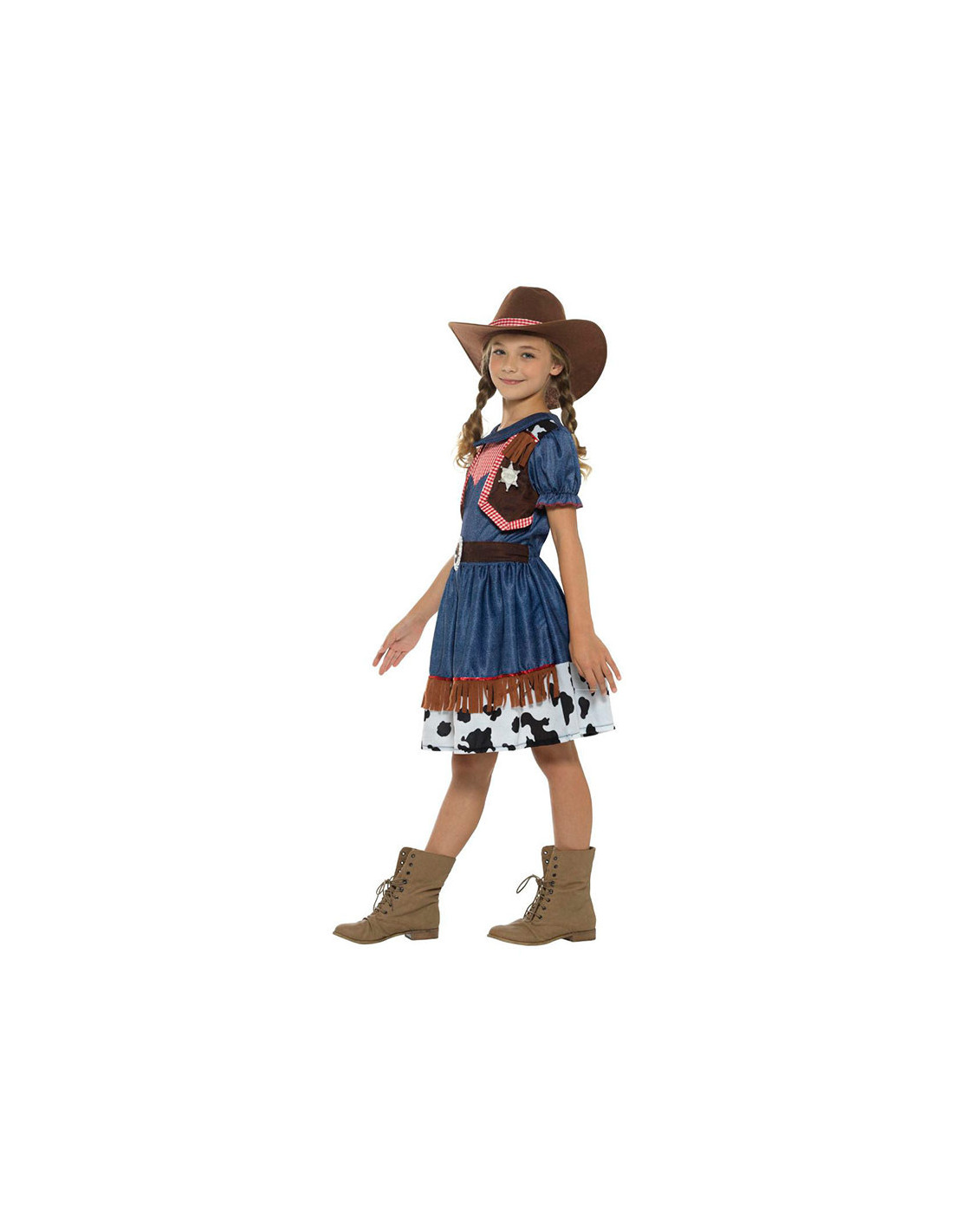 Este completo disfraz vaquera tejana para niña contiene vestido al que no le falta detalle, chaleco cosido y sombrero a juego.