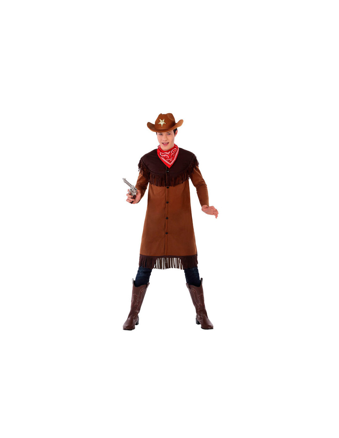 Disfraz vaquero adolescente que incluye chaqueta larga y bandana.