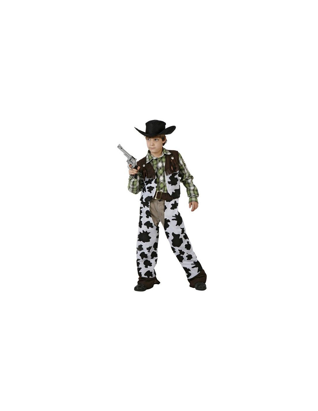 Contiene chaleco y pantalón-zahones estampados de vaca, Cabalga en el salvaje oeste con este disfraz de vaquero infantil, invita a tus amigos que se vistan de indios y podrás hacer un vídeo como una película de indios y vaqueros, antes prepara los diálogos de la película, te sera mas fácil.