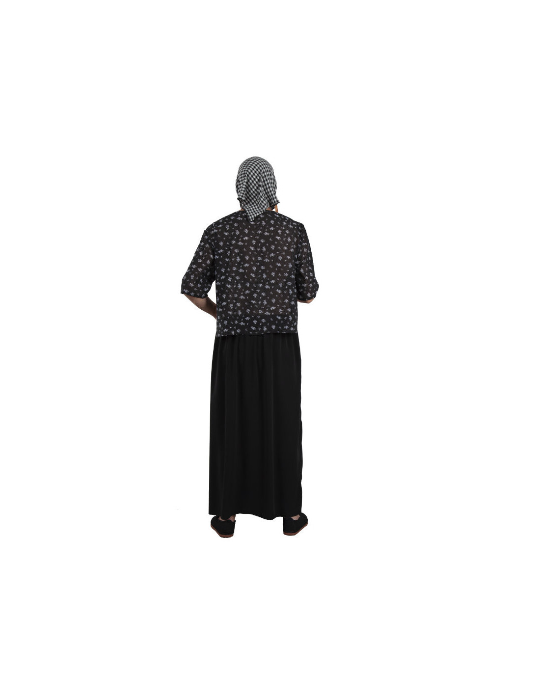 El disfraz Vieja de la Vara adulto que contiene pañuelo estampado, camisa con lazo, pechos de goma eva y falda negra con delantal estampado a juego con el pañuelo.