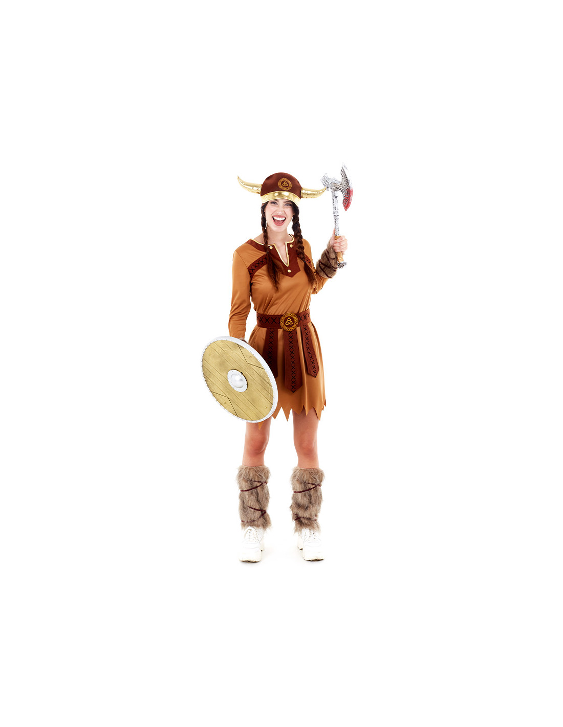 Precioso disfraz de Vikinga para mujer que esta compuesto por, vestido, gorro, cinturón, perneras y muñequeras. No incluye hacha, casco y escudo.