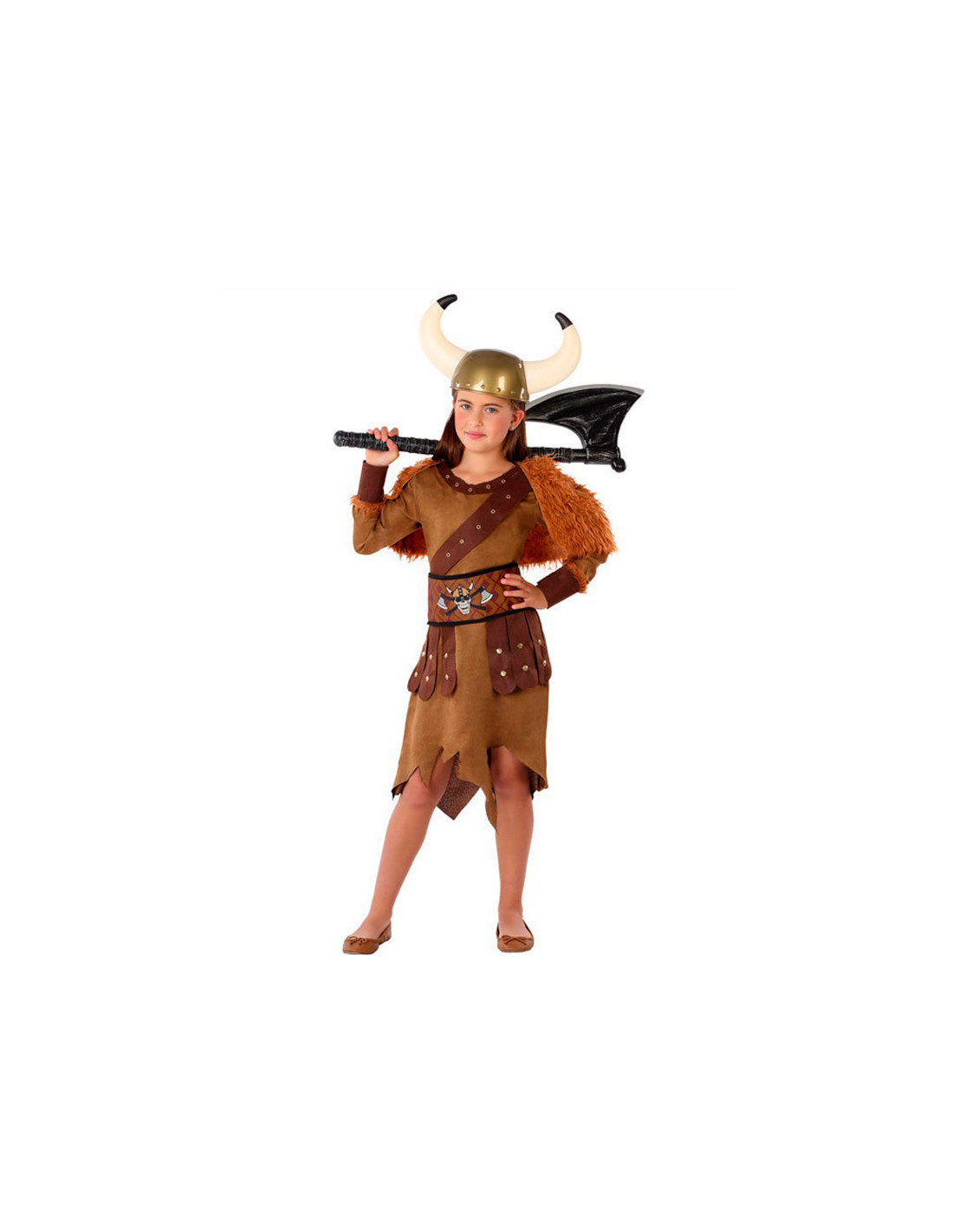 Disfraz vikinga salvaje para niña que incluye vestido, cubrehombros, tirante para el pecho y cinturón.