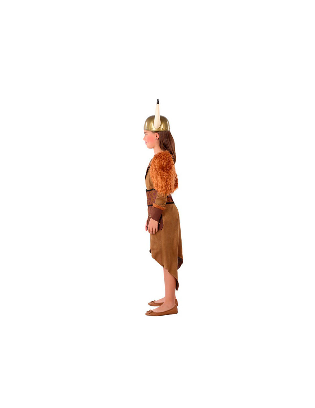 Disfraz vikinga salvaje para niña que contiene vestido marrón, cubrehombros de pelito, tirante cruzado para el pecho y cinturón.