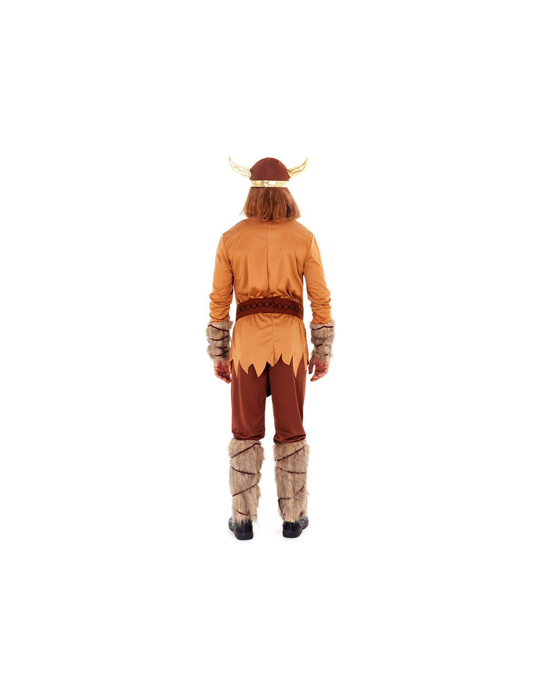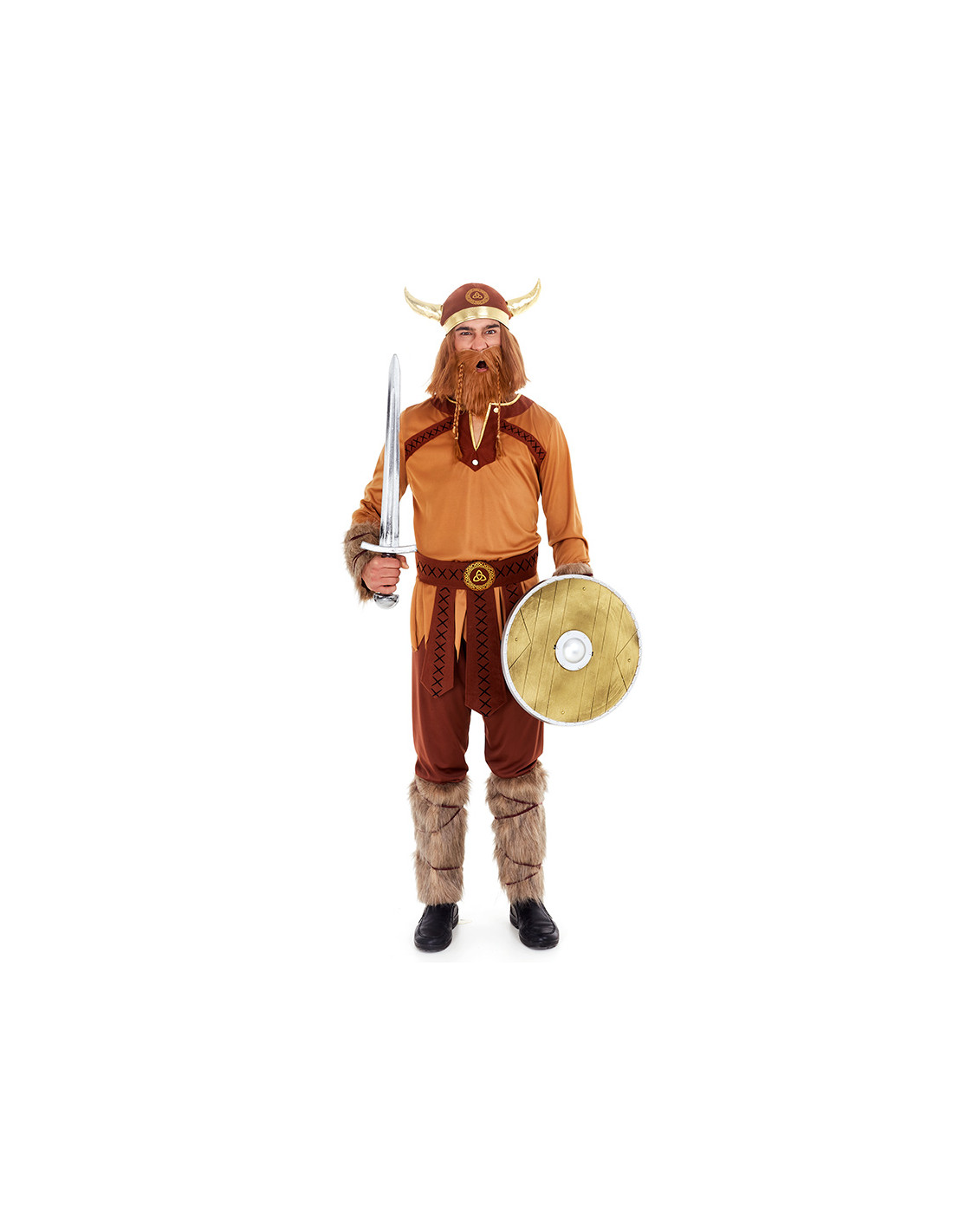 Disfraz vikingo guerrero para hombre que esta compuesto por, camiseta, pantalón, gorro, cinturón, perneras y muñequeras. No incluye casco, espada y escudo.ç